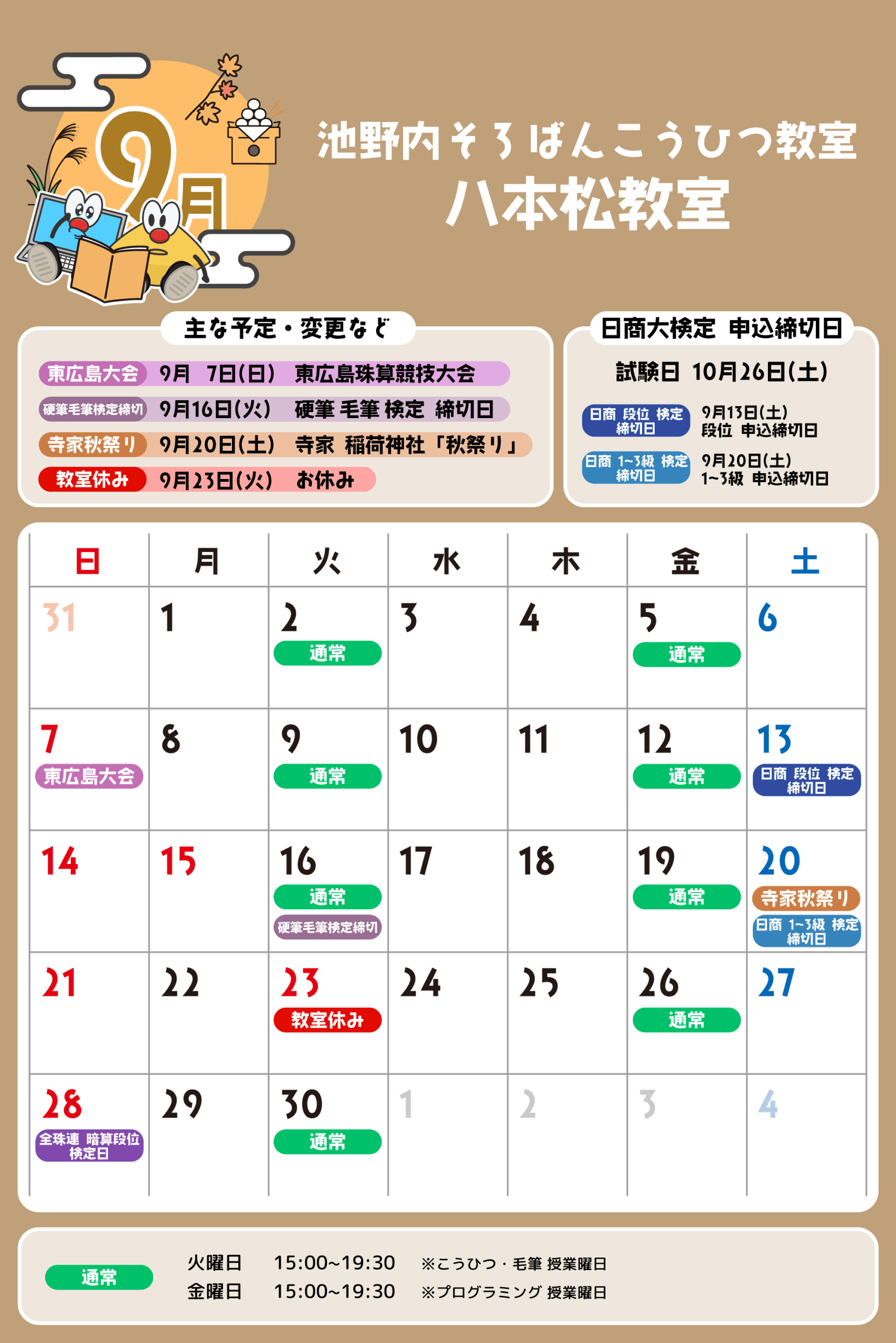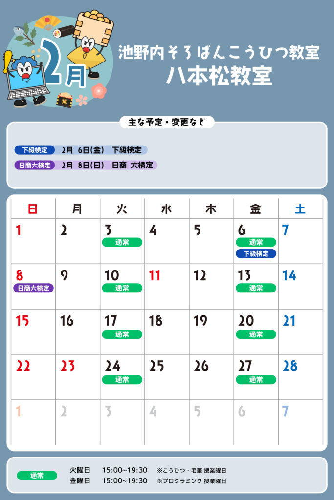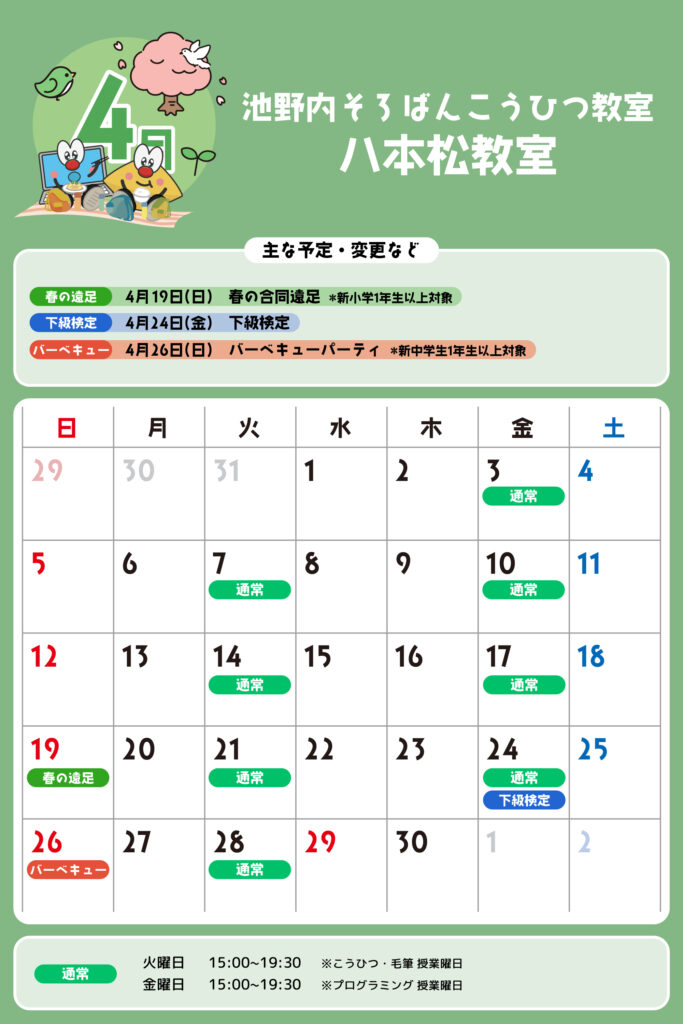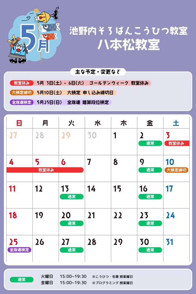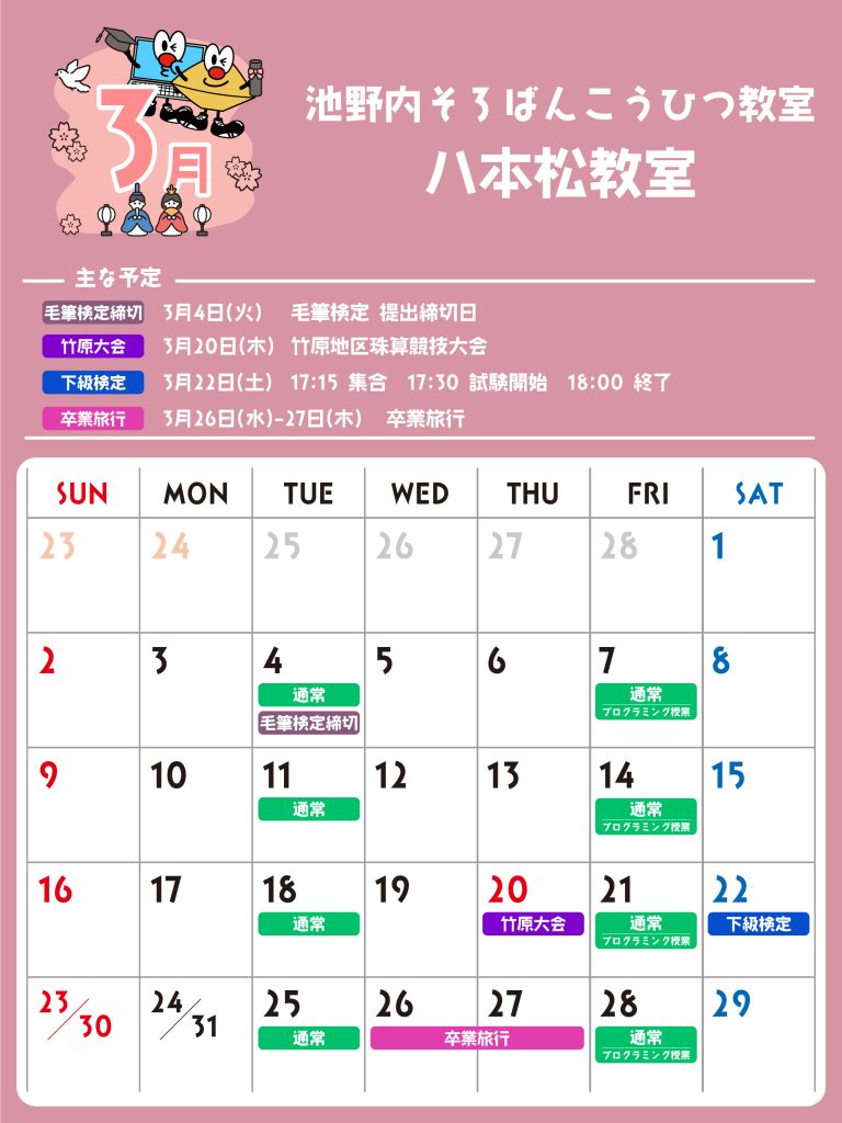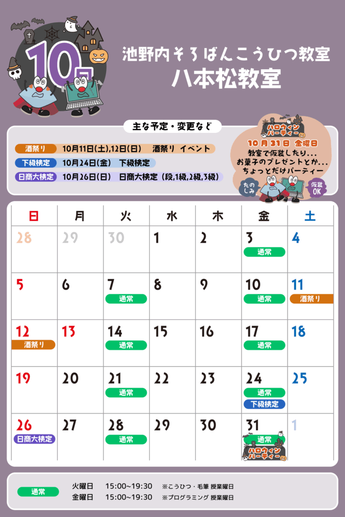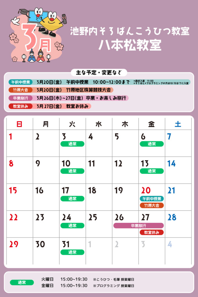 八本松教室 予定表 「通常」の授業曜日・時間 そろばん・暗算 火曜日:15:00〜19:30金曜日:15:00〜19:30 ※最終入室:終了時間の1時間前まで りとるらんど 火曜日:15:00〜19:30金曜日:15:00〜19:30 ※最終入室:終了時間の1時間前まで こうひつ 火曜日:15:00〜19:30 ※最終入室:終了時間の30分前まで 毛筆 火曜日:15:00〜19:30 ※最終入室:終了時間の1時間前まで プログラミング 金曜日:15:00〜19:00 ※最終入室:終了30分前まで ※予定表の「通常」の授業曜日・時間です。 2025
