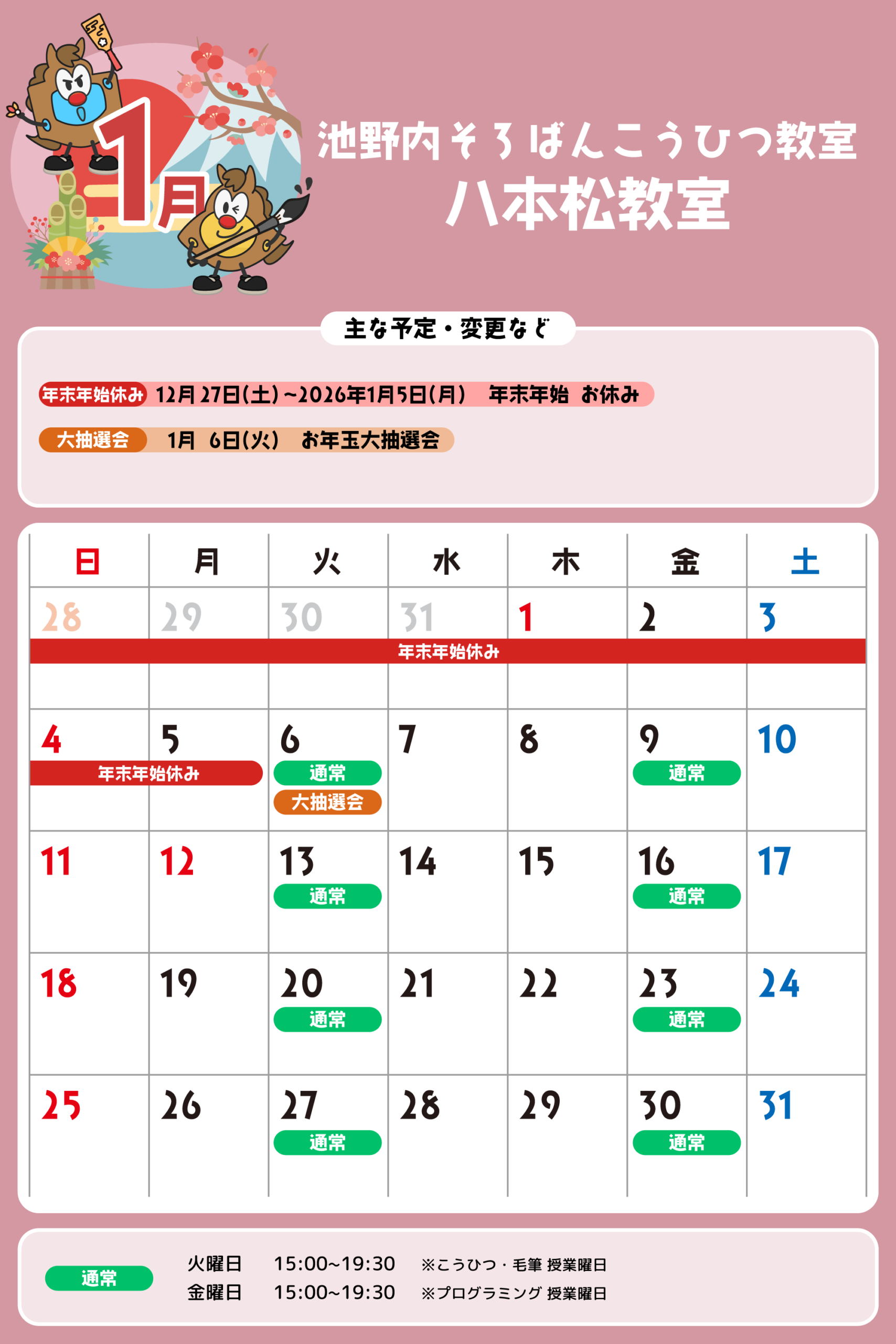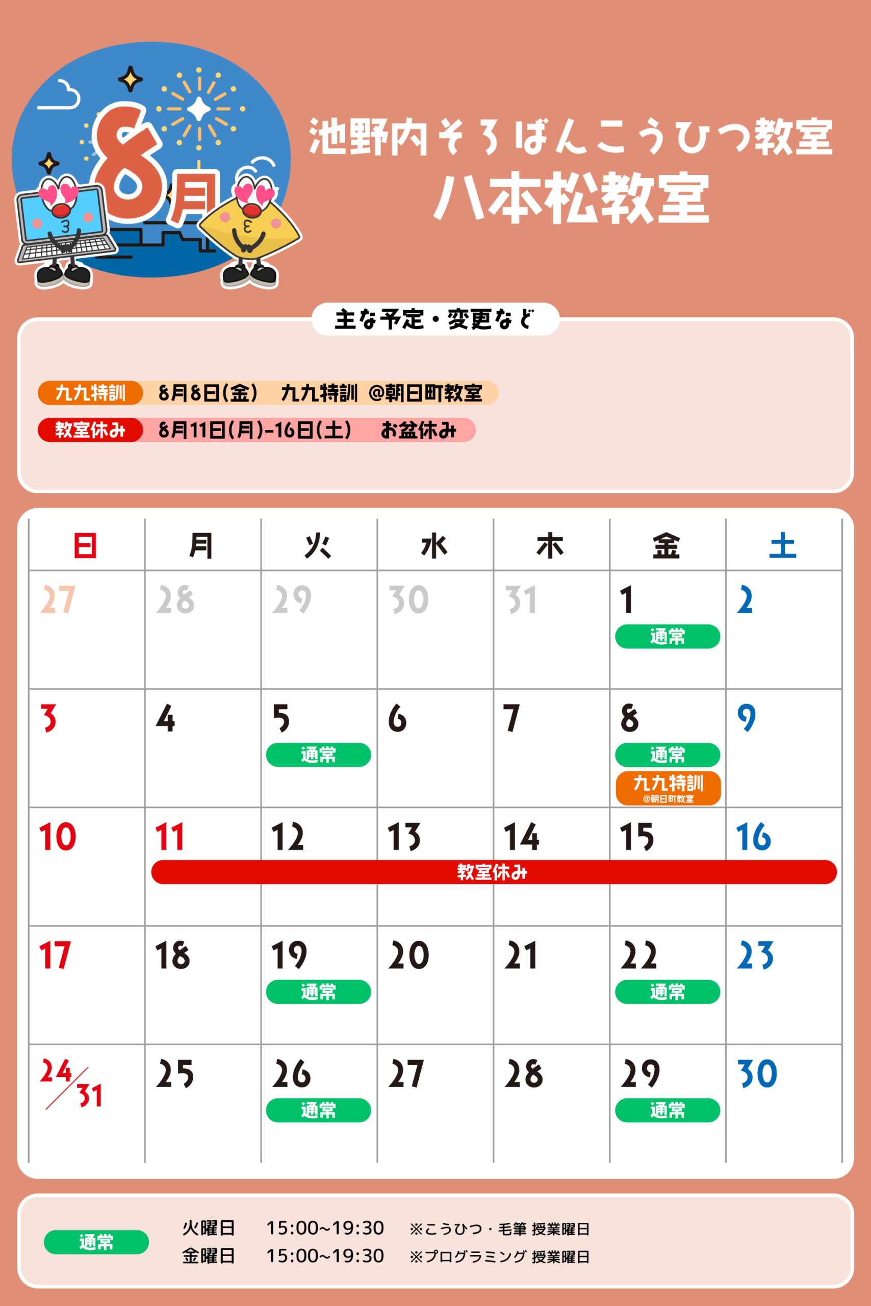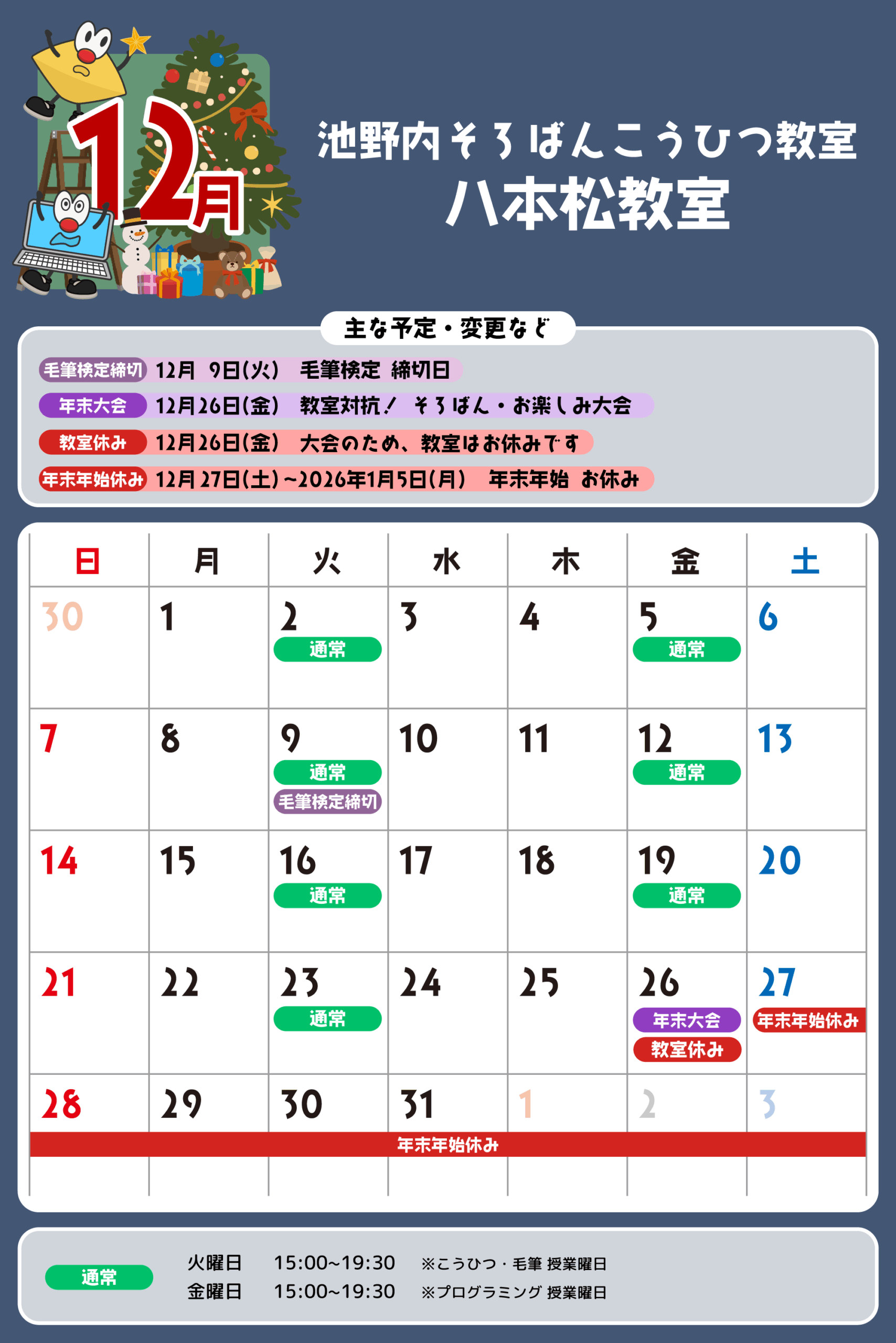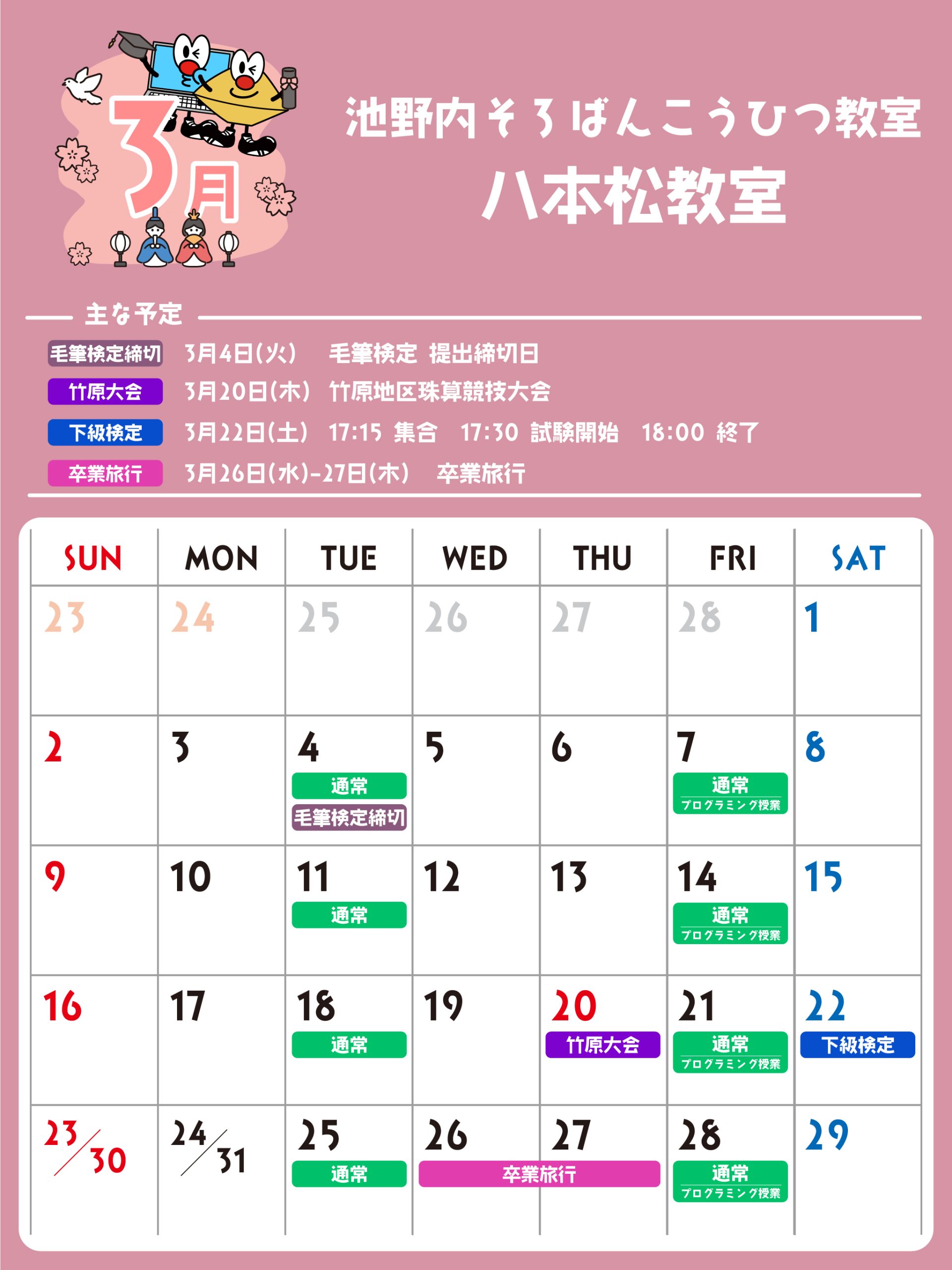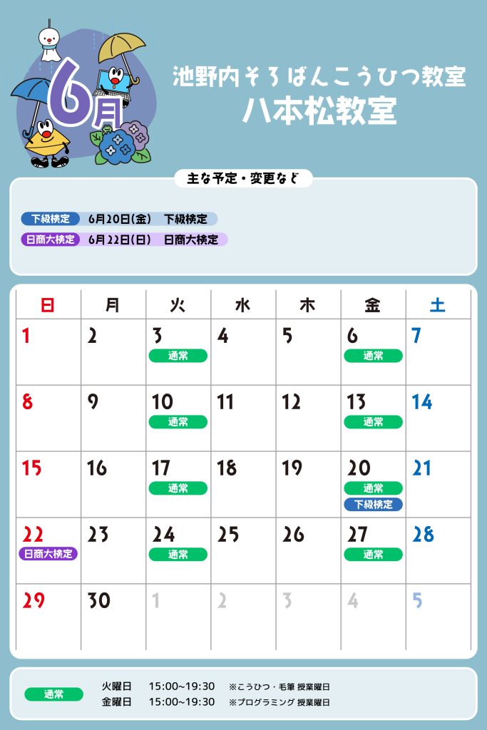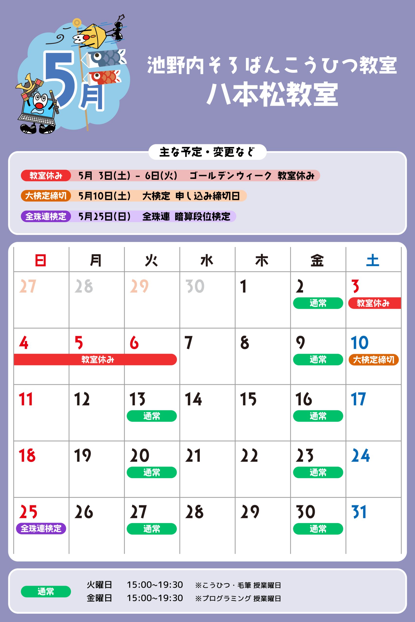 八本松教室 予定表 「通常」の授業曜日・時間 そろばん・暗算 火曜日:15:00〜19:30金曜日:15:00〜19:30 ※最終入室:終了時間の1時間前まで りとるらんど 火曜日:15:00〜19:30金曜日:15:00〜19:30 ※最終入室:終了時間の1時間前まで こうひつ 火曜日:15:00〜19:30 ※最終入室:終了時間の30分前まで 毛筆 火曜日:15:00〜19:30 ※最終入室:終了時間の1時間前まで プログラミング 金曜日:15:00〜19:00 ※最終入室:終了30分前まで ※予定表の「通常」の授業曜日・時間です。 2025