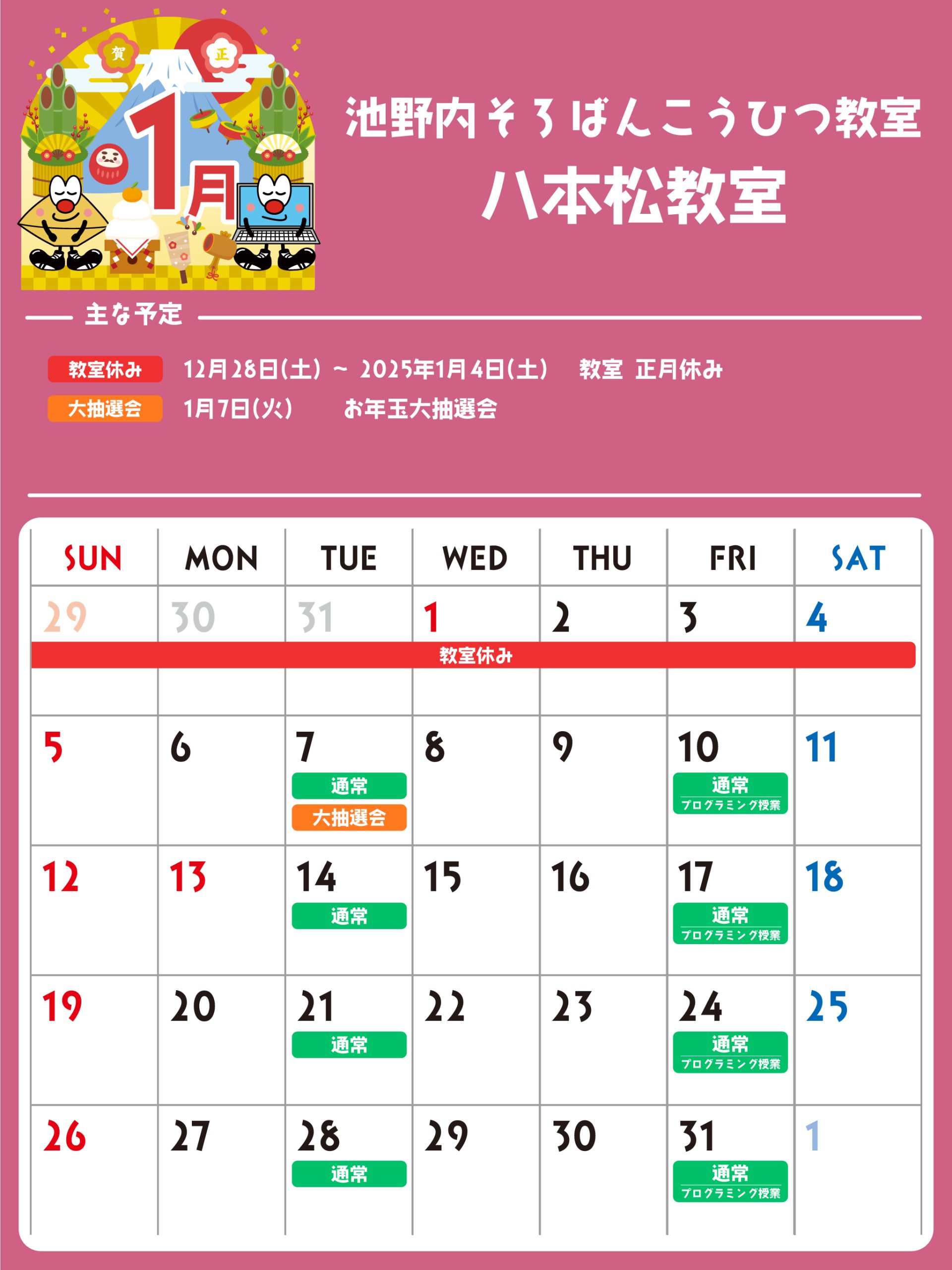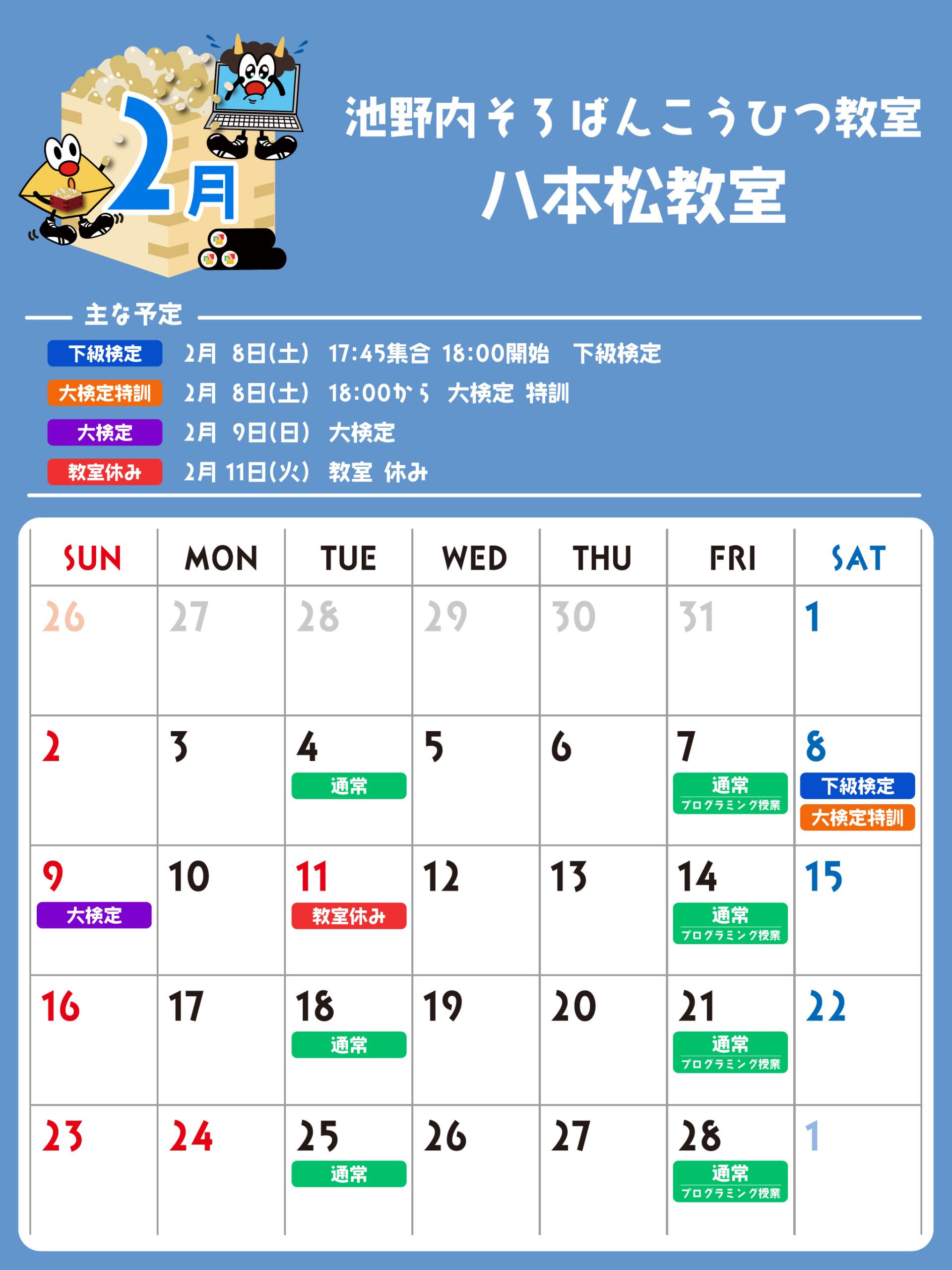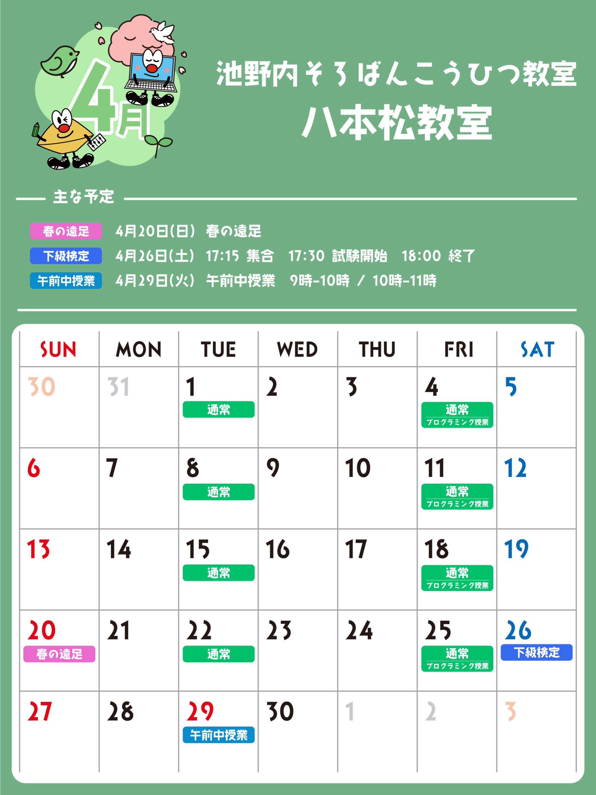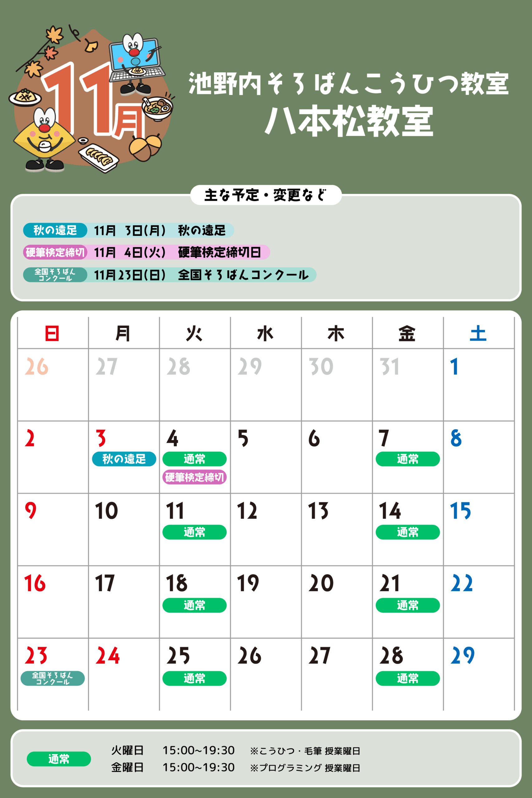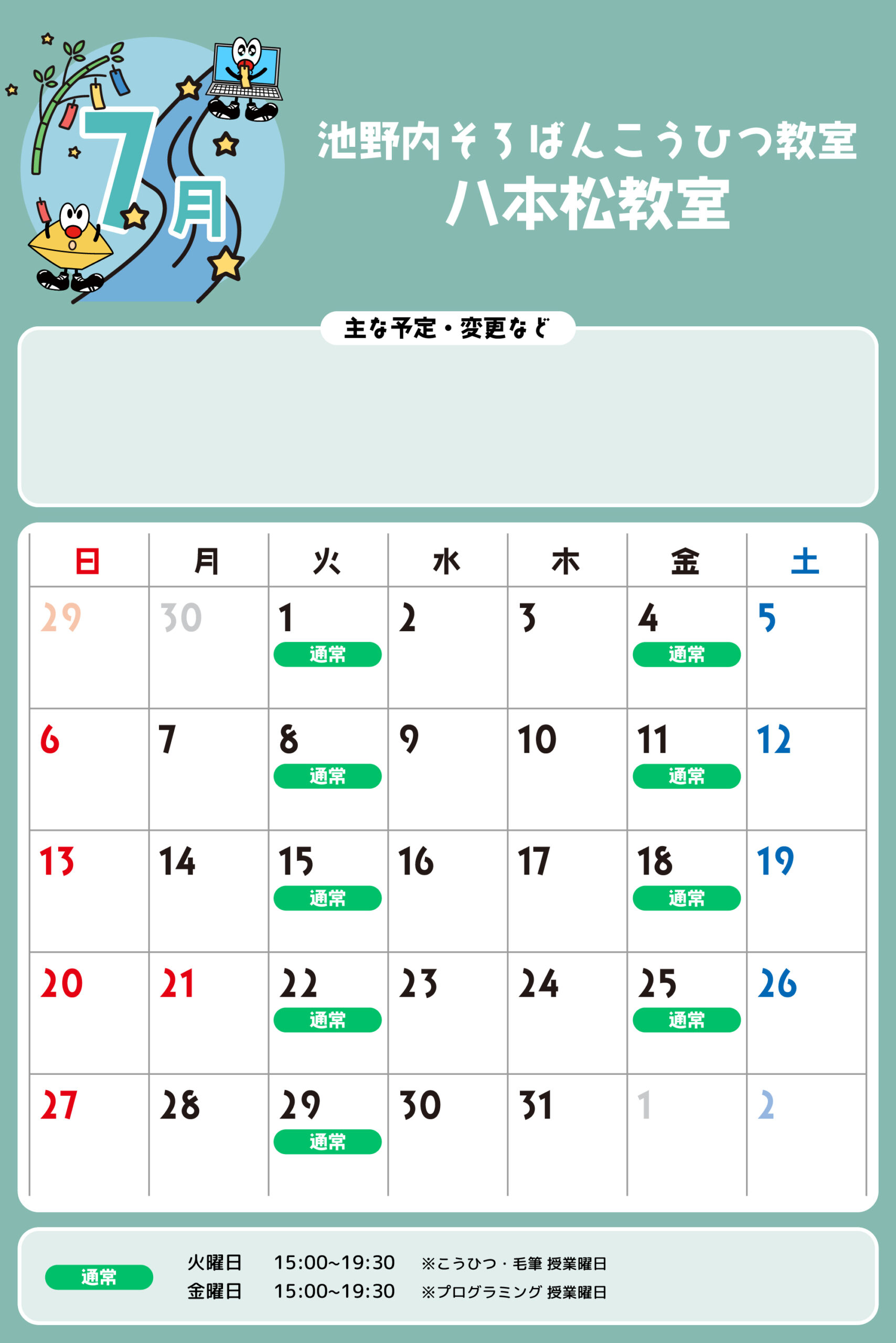 八本松教室 予定表 「通常」の授業曜日・時間 そろばん・暗算 火曜日:15:00〜19:30金曜日:15:00〜19:30 ※最終入室:終了時間の1時間前まで りとるらんど 火曜日:15:00〜19:30金曜日:15:00〜19:30 ※最終入室:終了時間の1時間前まで こうひつ 火曜日:15:00〜19:30 ※最終入室:終了時間の30分前まで 毛筆 火曜日:15:00〜19:30 ※最終入室:終了時間の1時間前まで プログラミング 金曜日:15:00〜19:00 ※最終入室:終了30分前まで ※予定表の「通常」の授業曜日・時間です。 2025