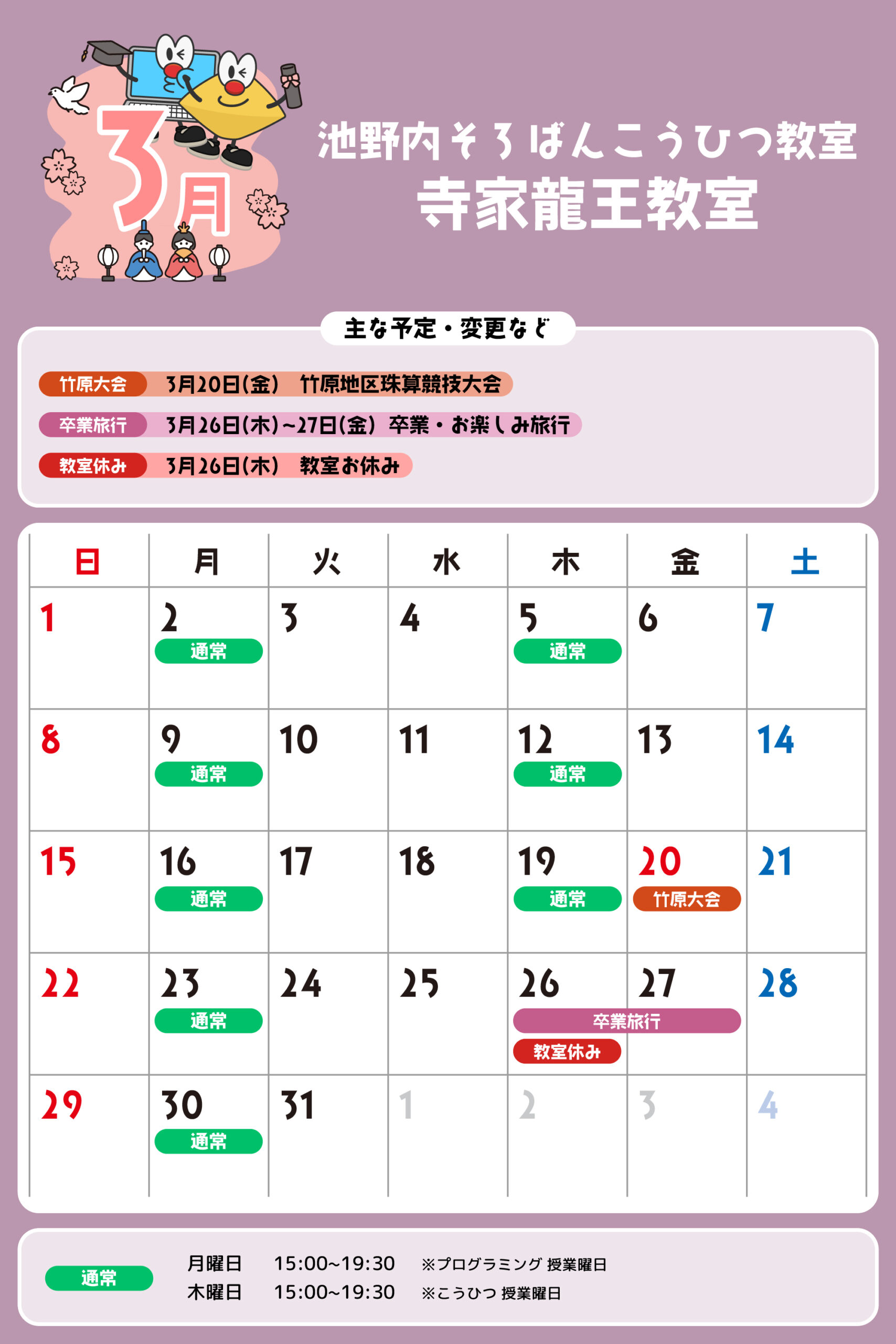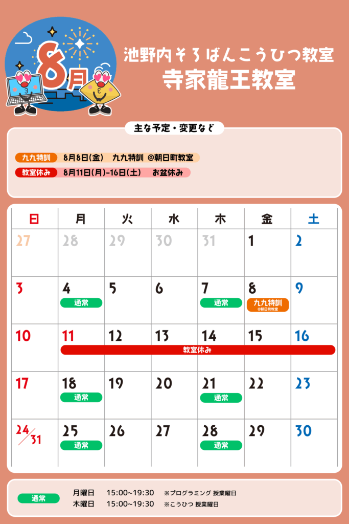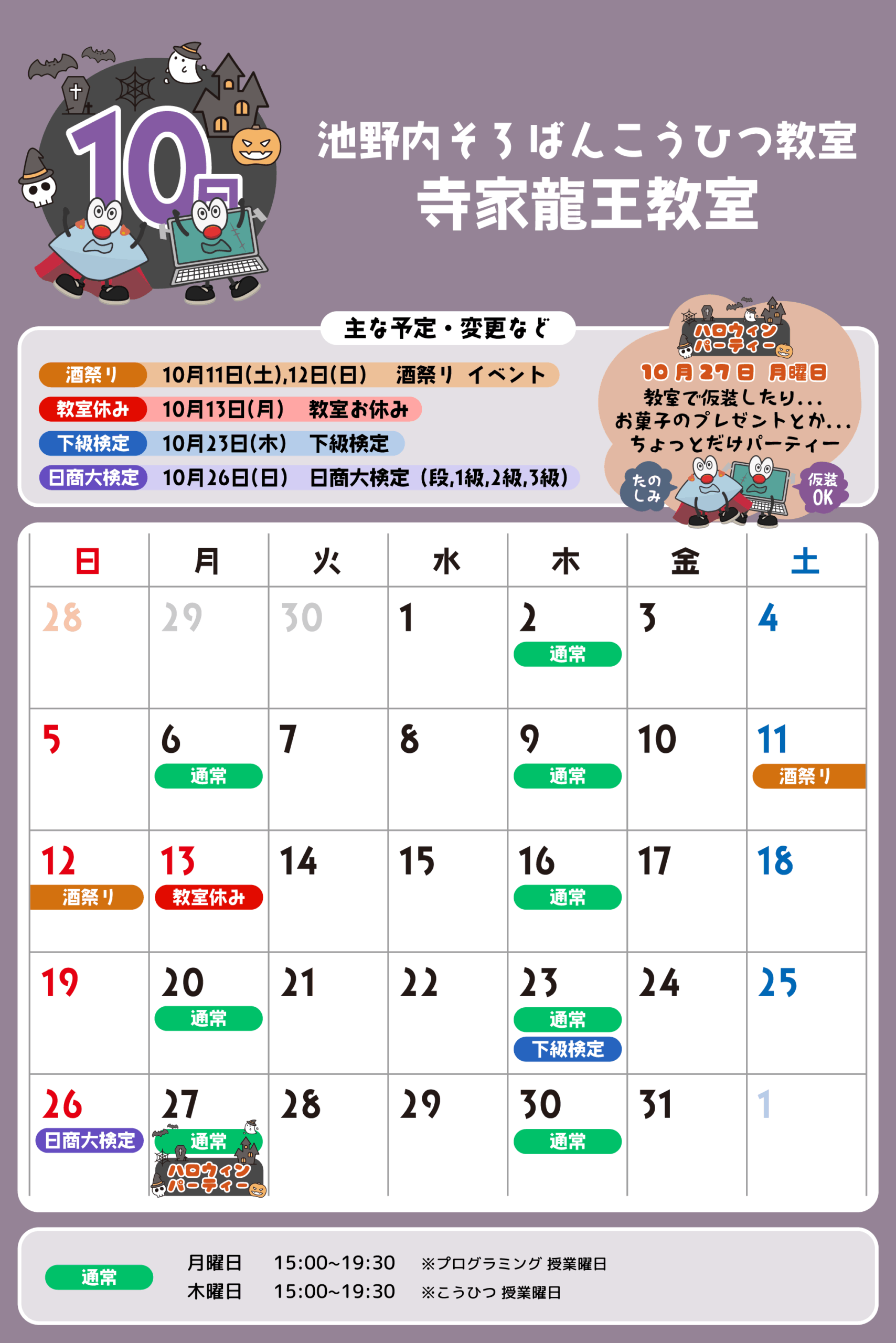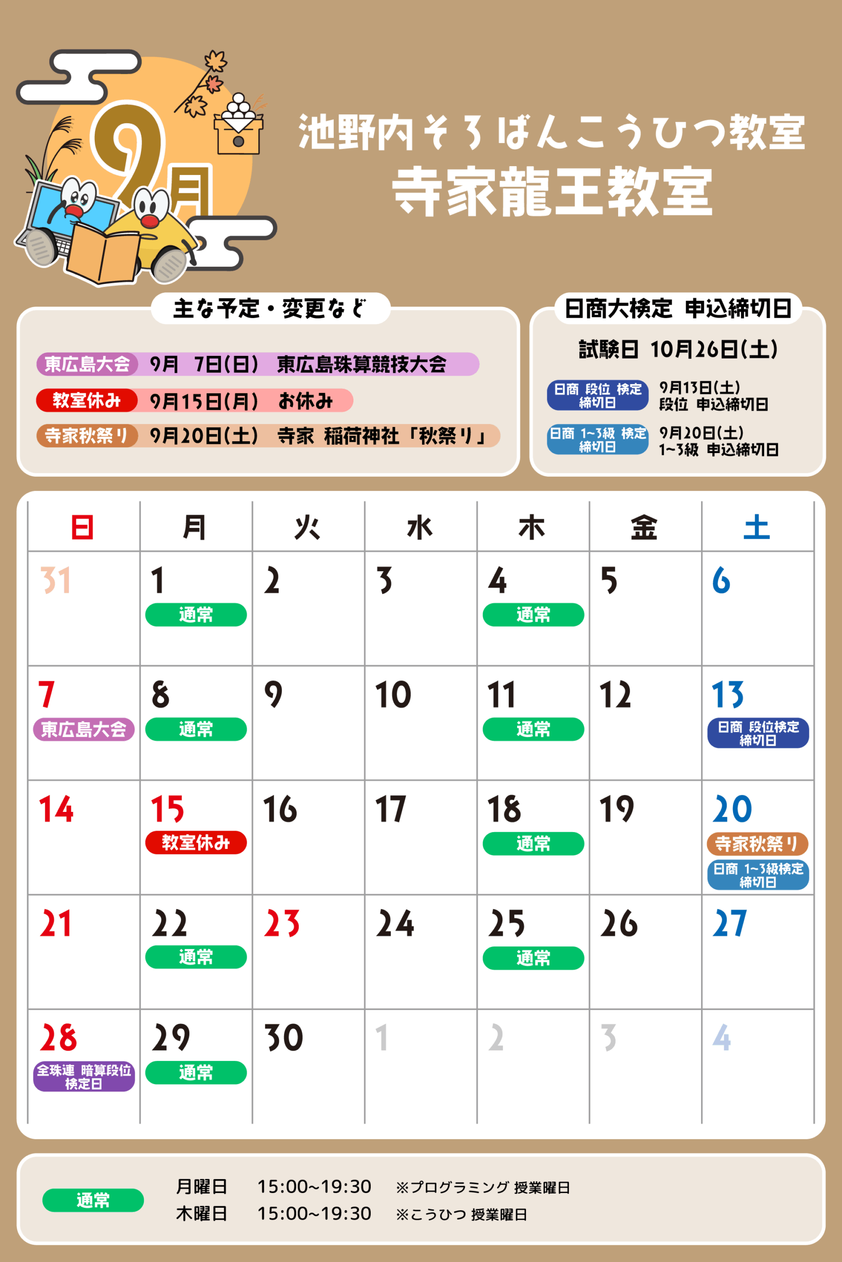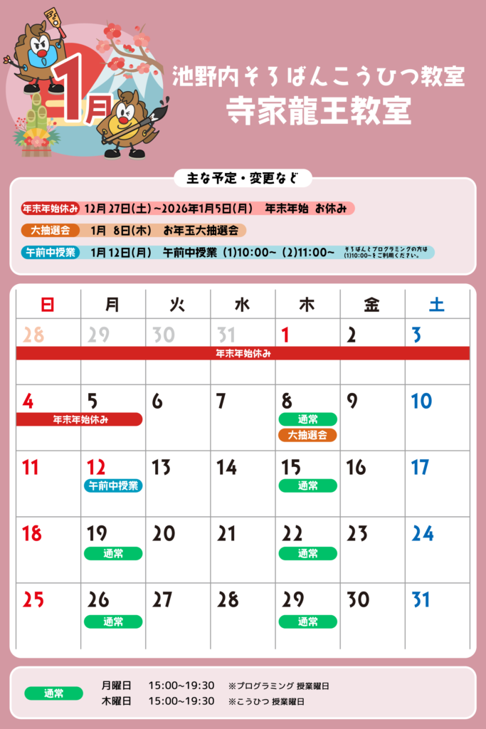 寺家龍王教室 予定表 「通常」の授業曜日・時間 そろばん・暗算 月曜日:15:00〜19:30木曜日:15:00〜19:30 ※最終入室:終了時間の1時間前まで りとるらんど 月曜日:15:00〜19:30木曜日:15:00〜19:30 ※最終入室:終了時間の1時間前まで こうひつ 木曜日:15:00〜19:30 ※最終入室:終了時間の30分前まで プログラミング 月曜日:15:00〜19:00 ※最終入室:終了30分前まで ※予定表の「通常」の授業曜日・時間です。 2024