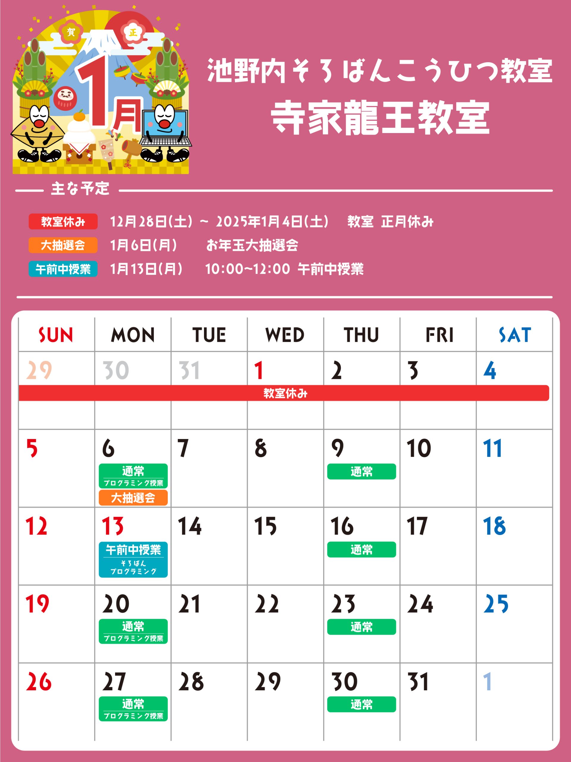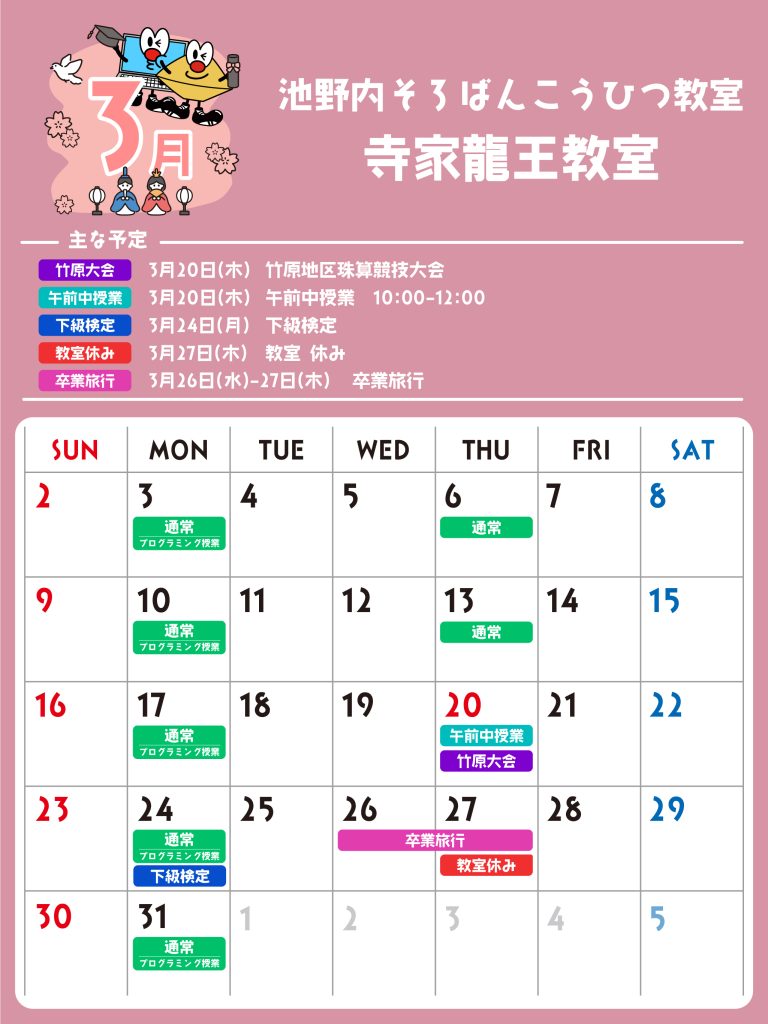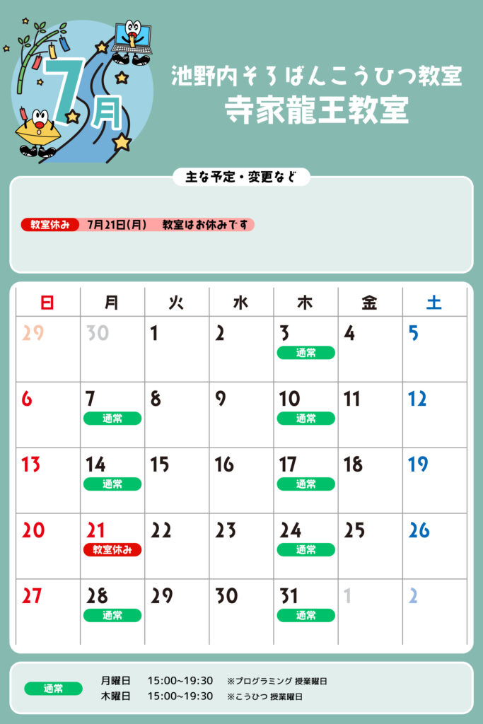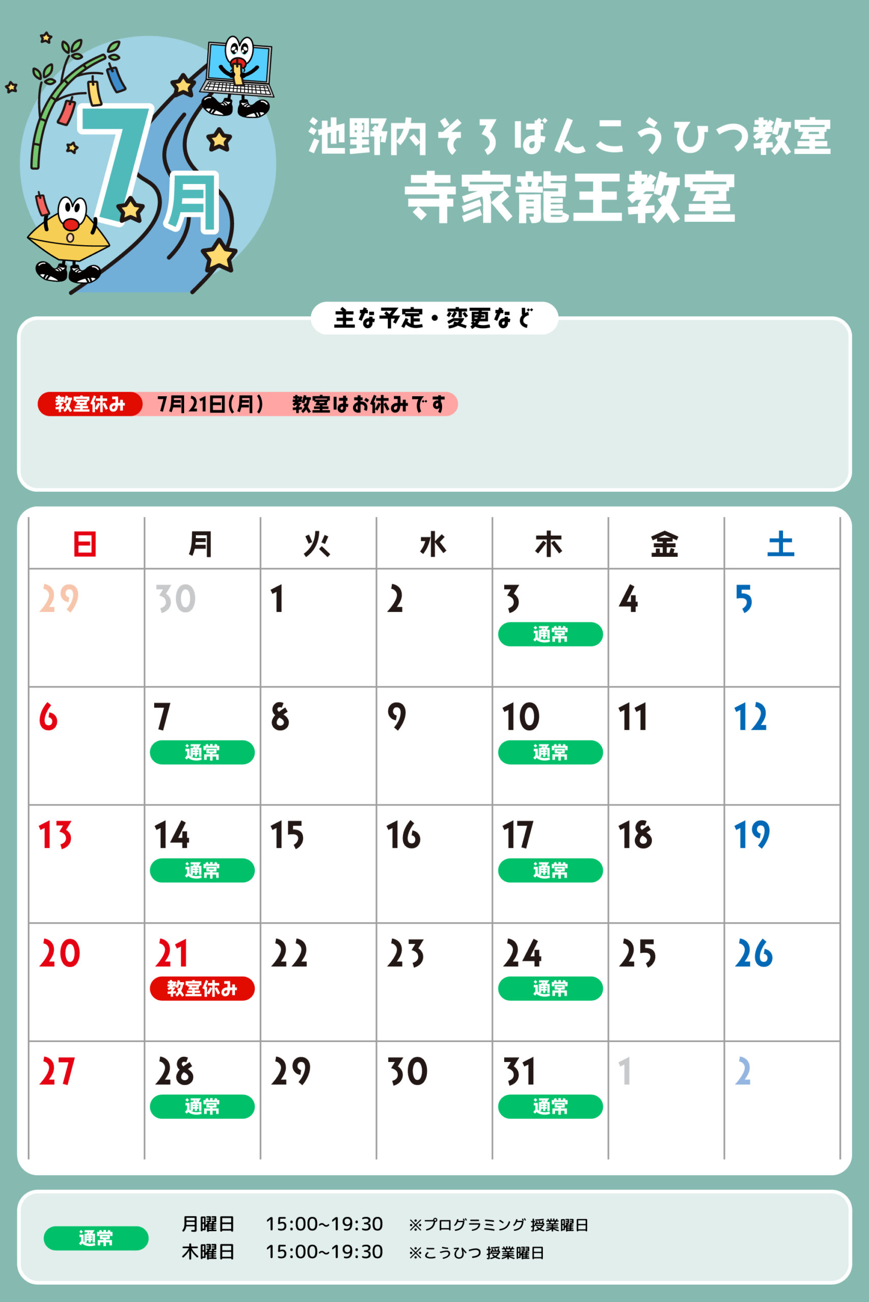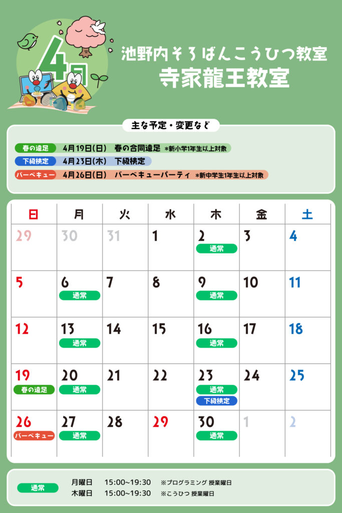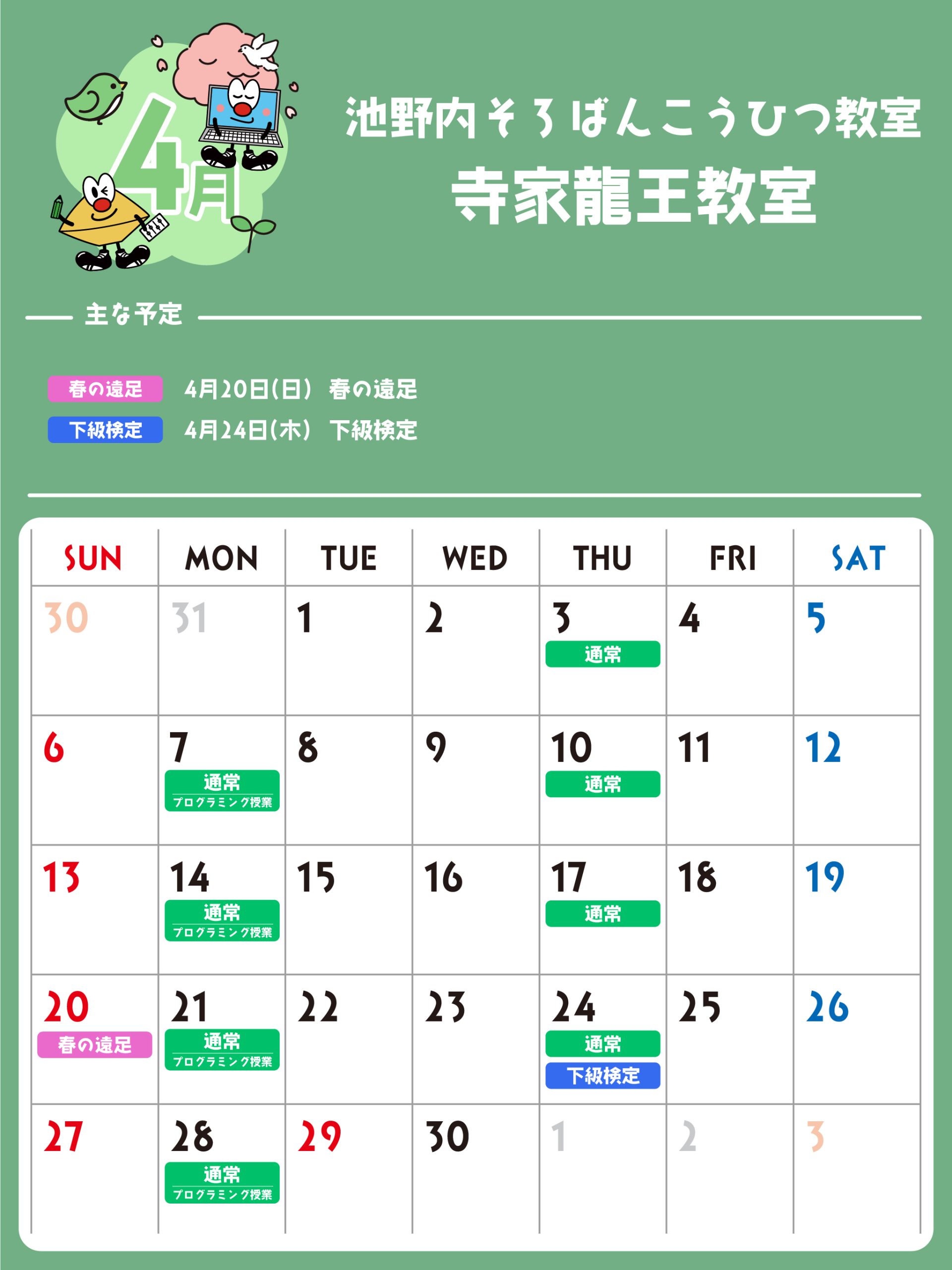 寺家龍王教室 予定表 「通常」の授業曜日・時間 そろばん・暗算 月曜日:15:00〜19:30木曜日:15:00〜19:30 ※最終入室:終了時間の1時間前まで りとるらんど 月曜日:15:00〜19:30木曜日:15:00〜19:30 ※最終入室:終了時間の1時間前まで こうひつ 木曜日:15:00〜19:30 ※最終入室:終了時間の30分前まで プログラミング 月曜日:15:00〜19:00 ※最終入室:終了30分前まで ※予定表の「通常」の授業曜日・時間です。 2024