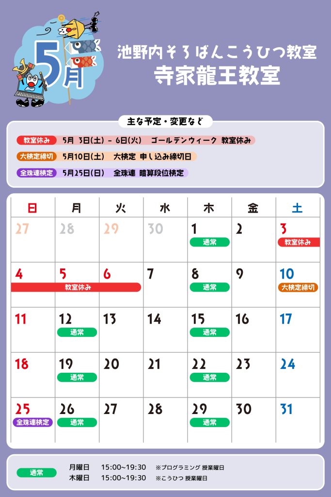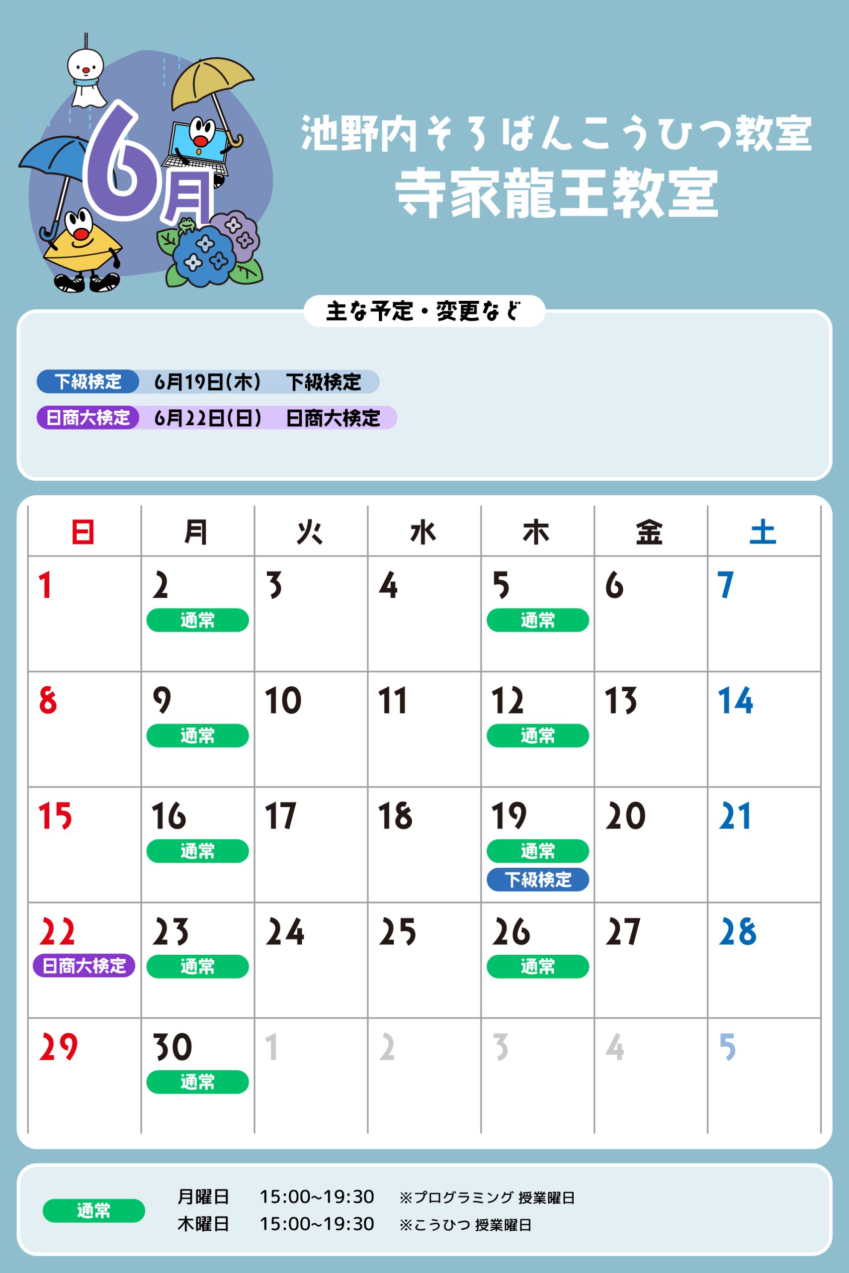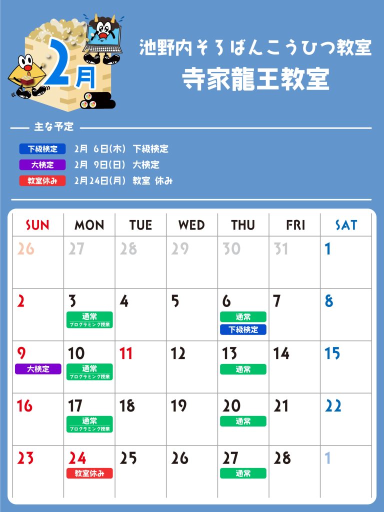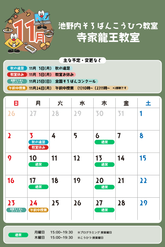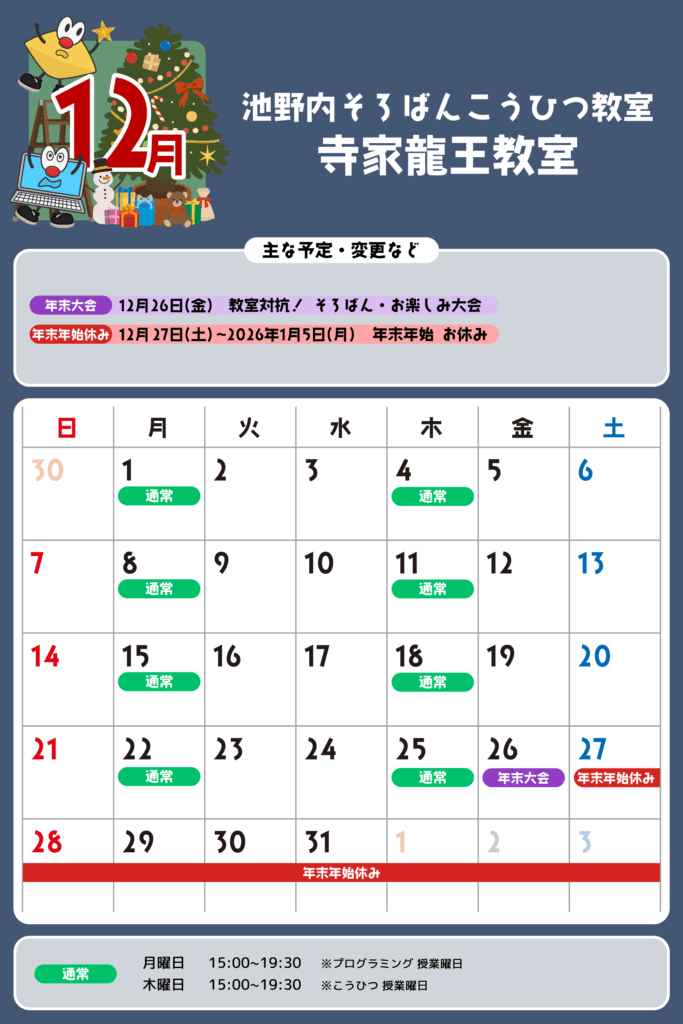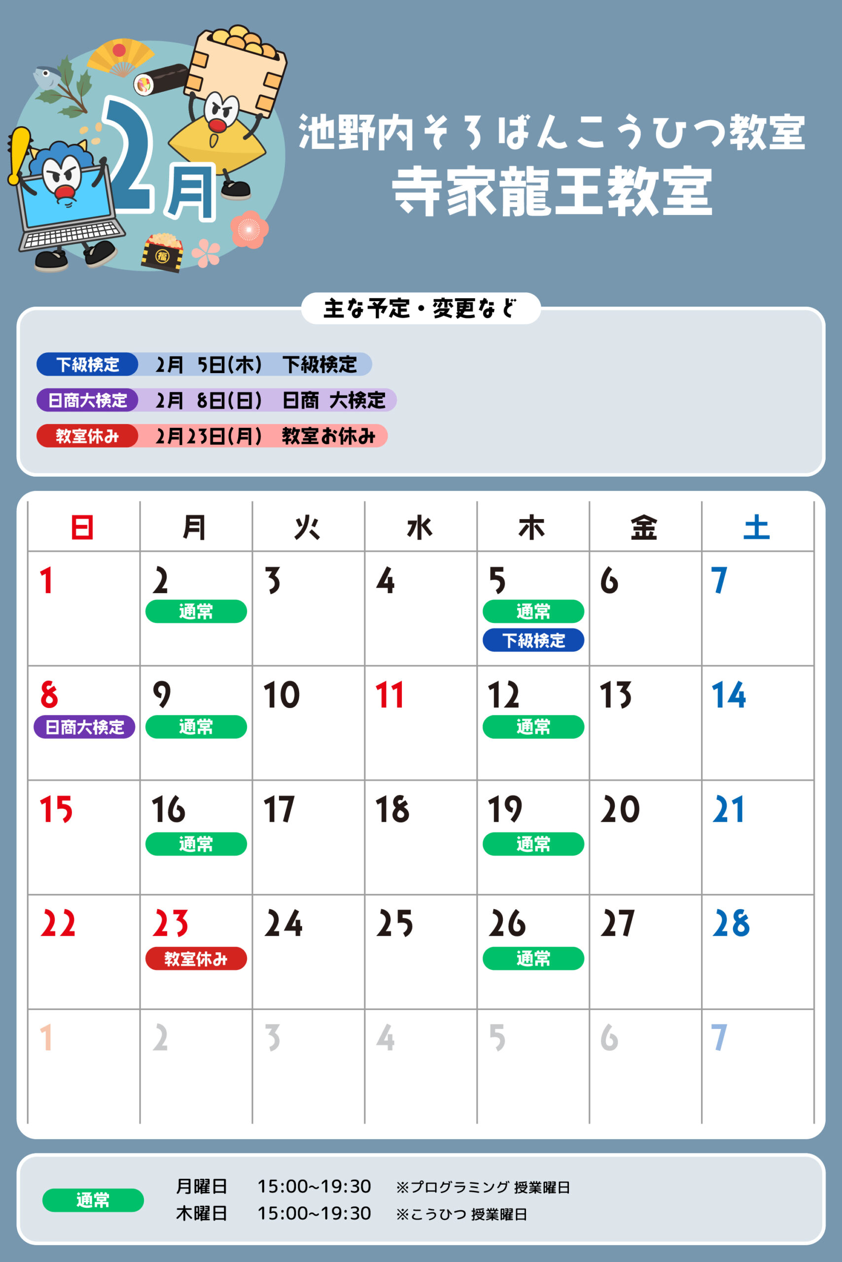 寺家龍王教室 予定表 「通常」の授業曜日・時間 そろばん・暗算 月曜日:15:00〜19:30木曜日:15:00〜19:30 ※最終入室:終了時間の1時間前まで りとるらんど 月曜日:15:00〜19:30木曜日:15:00〜19:30 ※最終入室:終了時間の1時間前まで こうひつ 木曜日:15:00〜19:30 ※最終入室:終了時間の30分前まで プログラミング 月曜日:15:00〜19:00 ※最終入室:終了30分前まで ※予定表の「通常」の授業曜日・時間です。 2024