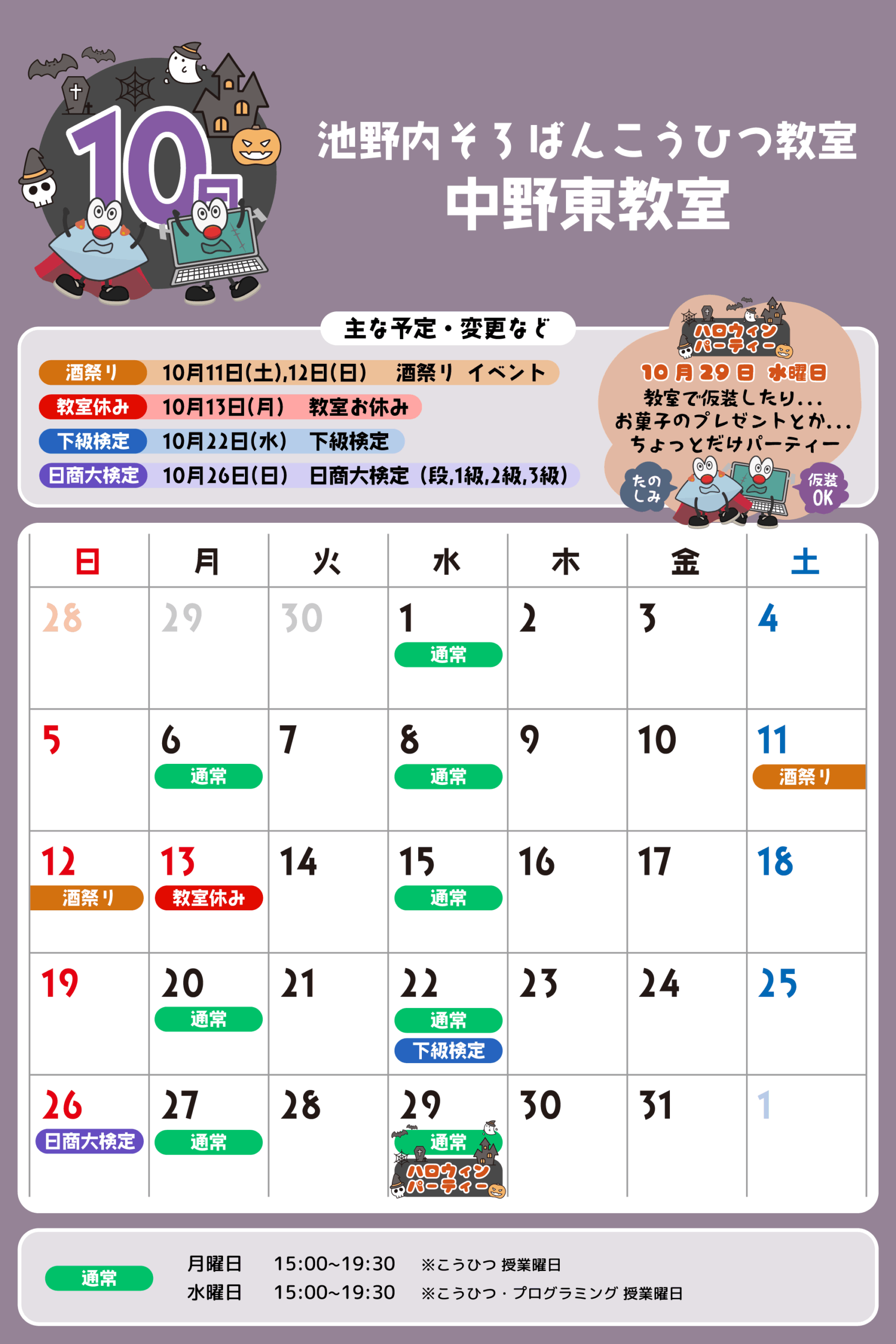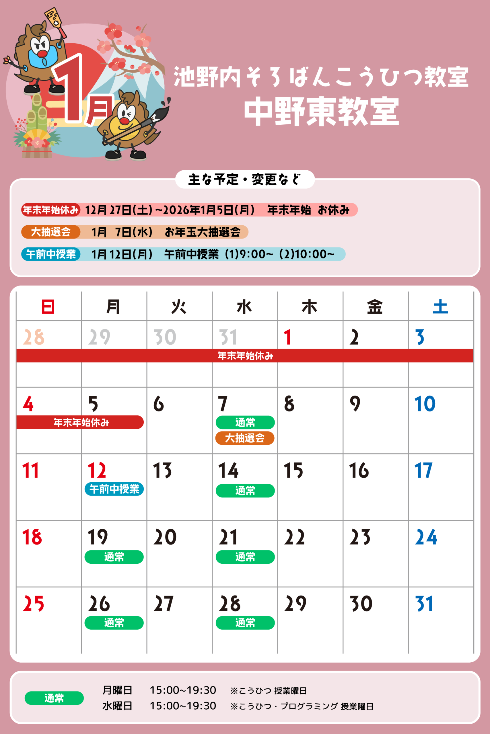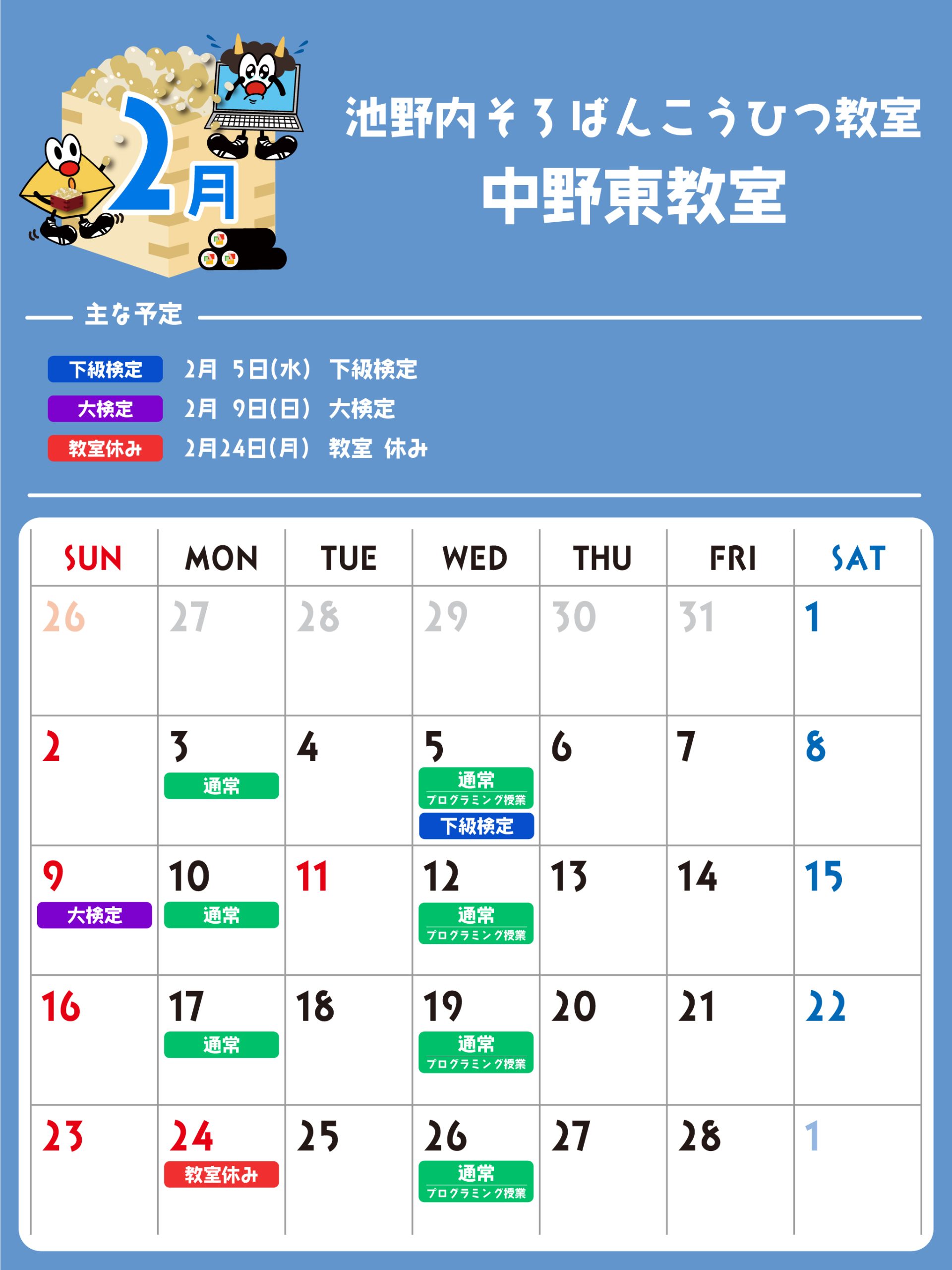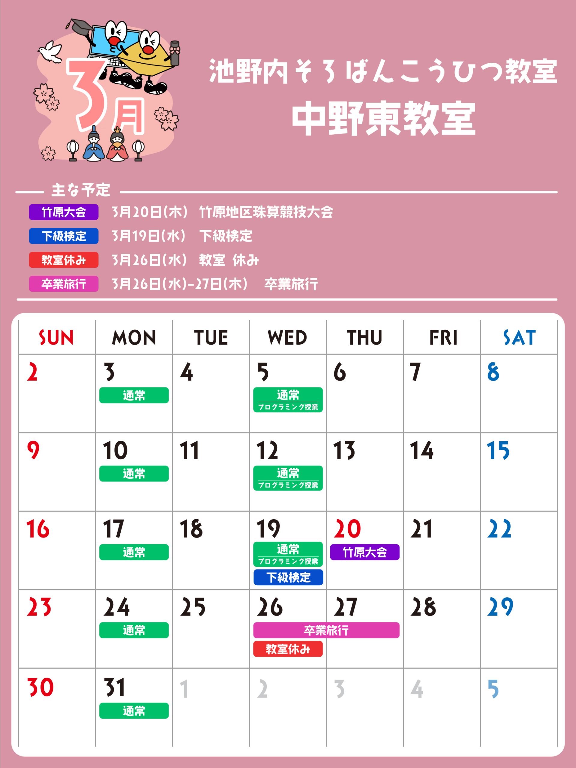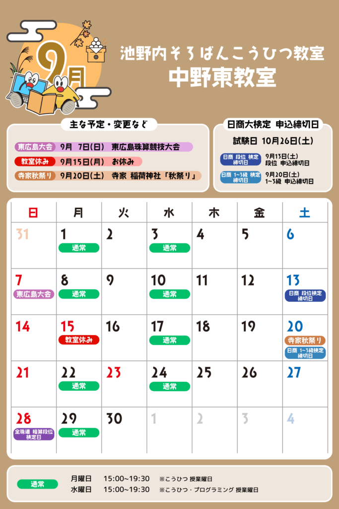 中野東教室 予定表 「通常」の授業曜日・時間 そろばん・暗算 月曜日:15:00〜19:30水曜日:15:00〜19:30 ※最終入室:終了時間の1時間前まで りとるらんど 月曜日:15:00〜19:30水曜日:15:00〜19:30 ※最終入室:終了時間の1時間前まで こうひつ 月曜日:15:00〜19:30 水曜日:15:00〜19:30 ※最終入室:終了時間の30分前まで プログラミング 水曜日:15:00〜19:00 ※最終入室:終了30分前まで ※予定表の「通常」の授業曜日・時間です。 2025