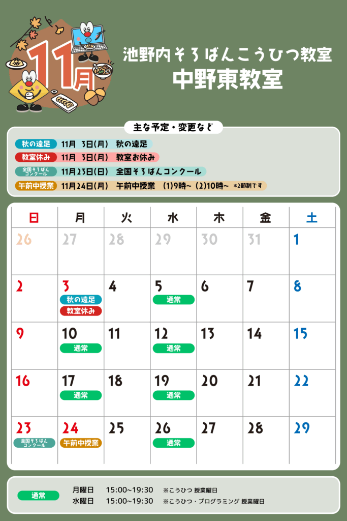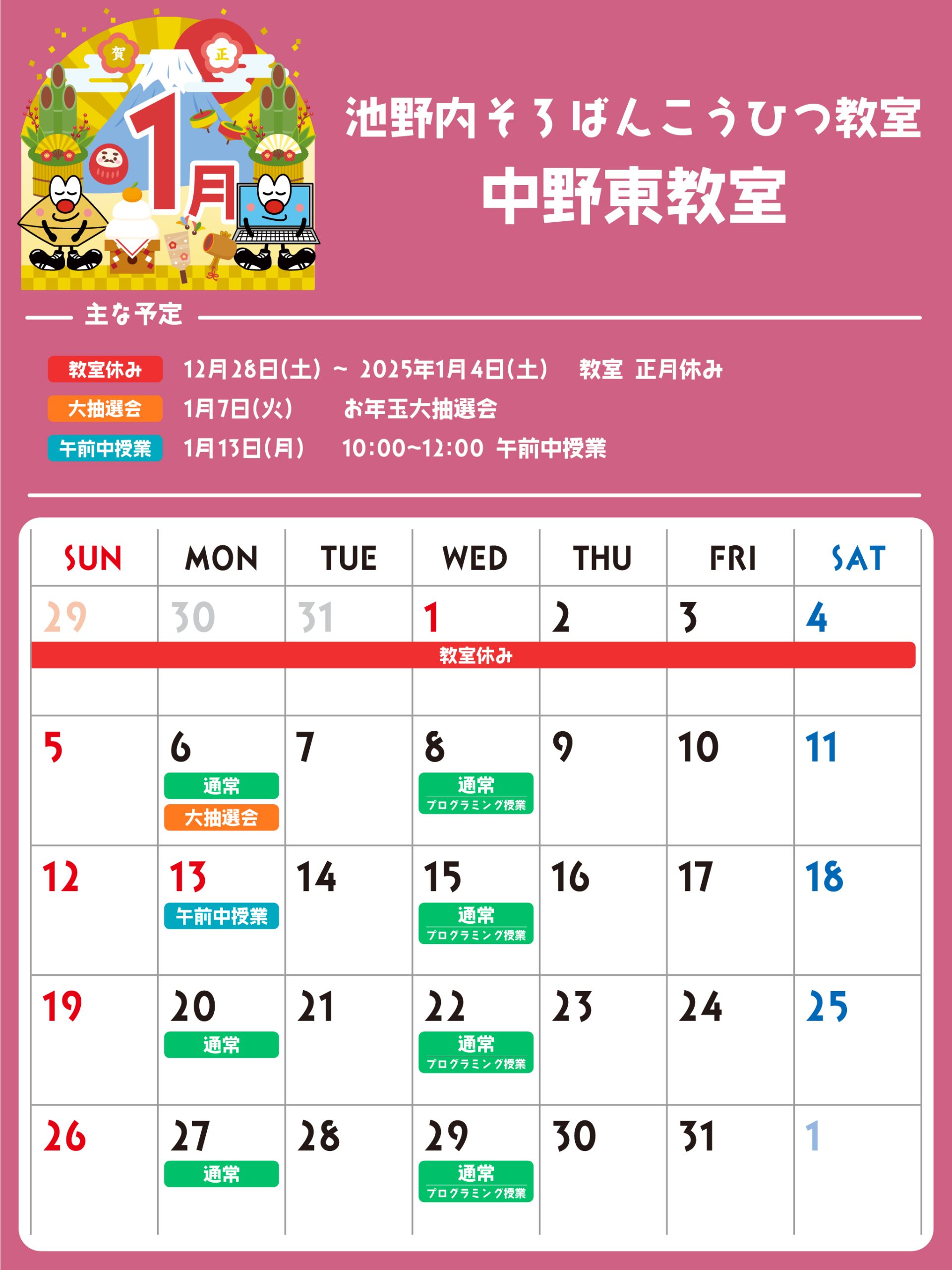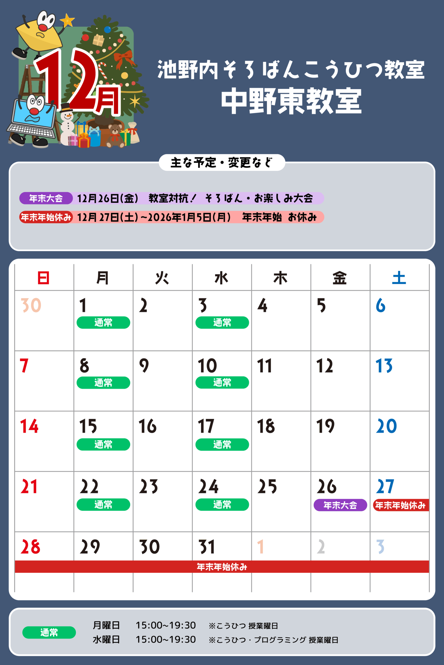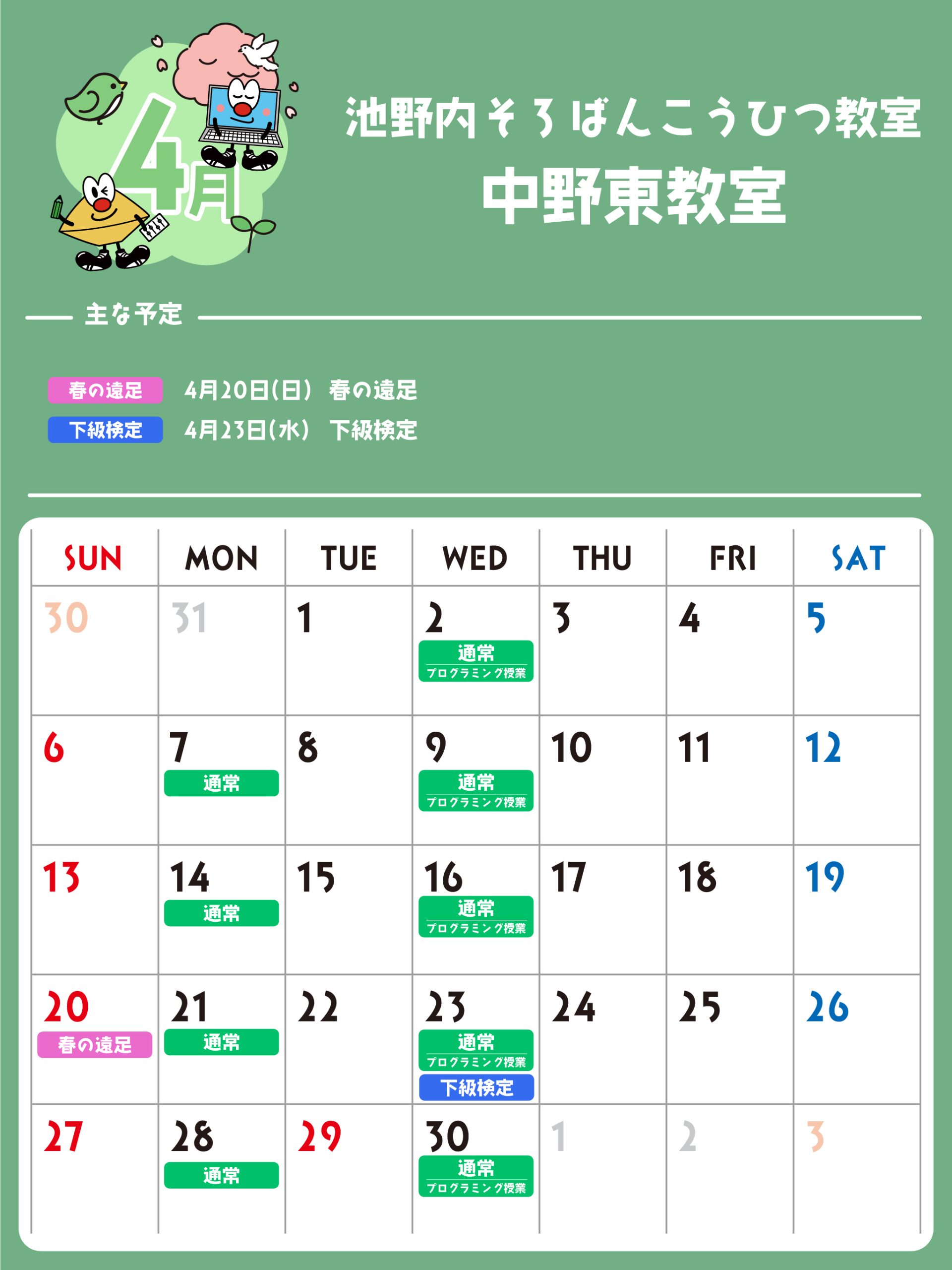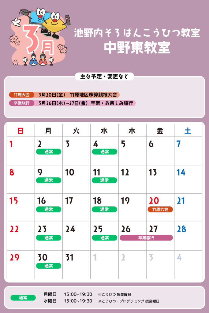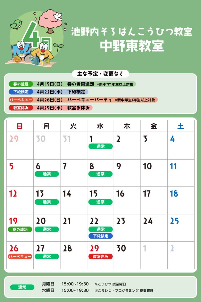 中野東教室 予定表 「通常」の授業曜日・時間 そろばん・暗算 月曜日:15:00〜19:30水曜日:15:00〜19:30 ※最終入室:終了時間の1時間前まで りとるらんど 月曜日:15:00〜19:30水曜日:15:00〜19:30 ※最終入室:終了時間の1時間前まで こうひつ 月曜日:15:00〜19:30 水曜日:15:00〜19:30 ※最終入室:終了時間の30分前まで プログラミング 水曜日:15:00〜19:00 ※最終入室:終了30分前まで ※予定表の「通常」の授業曜日・時間です。 2025