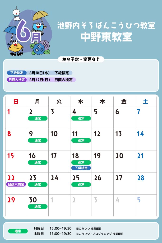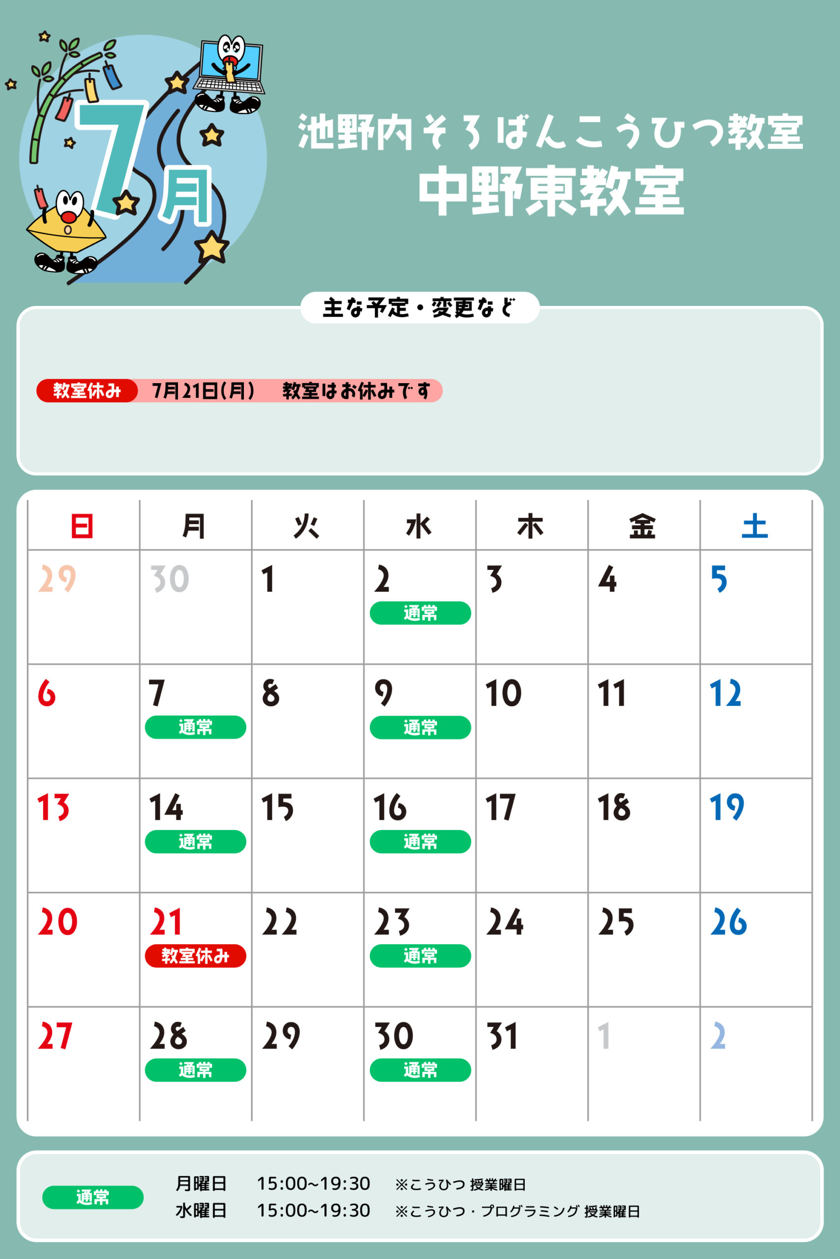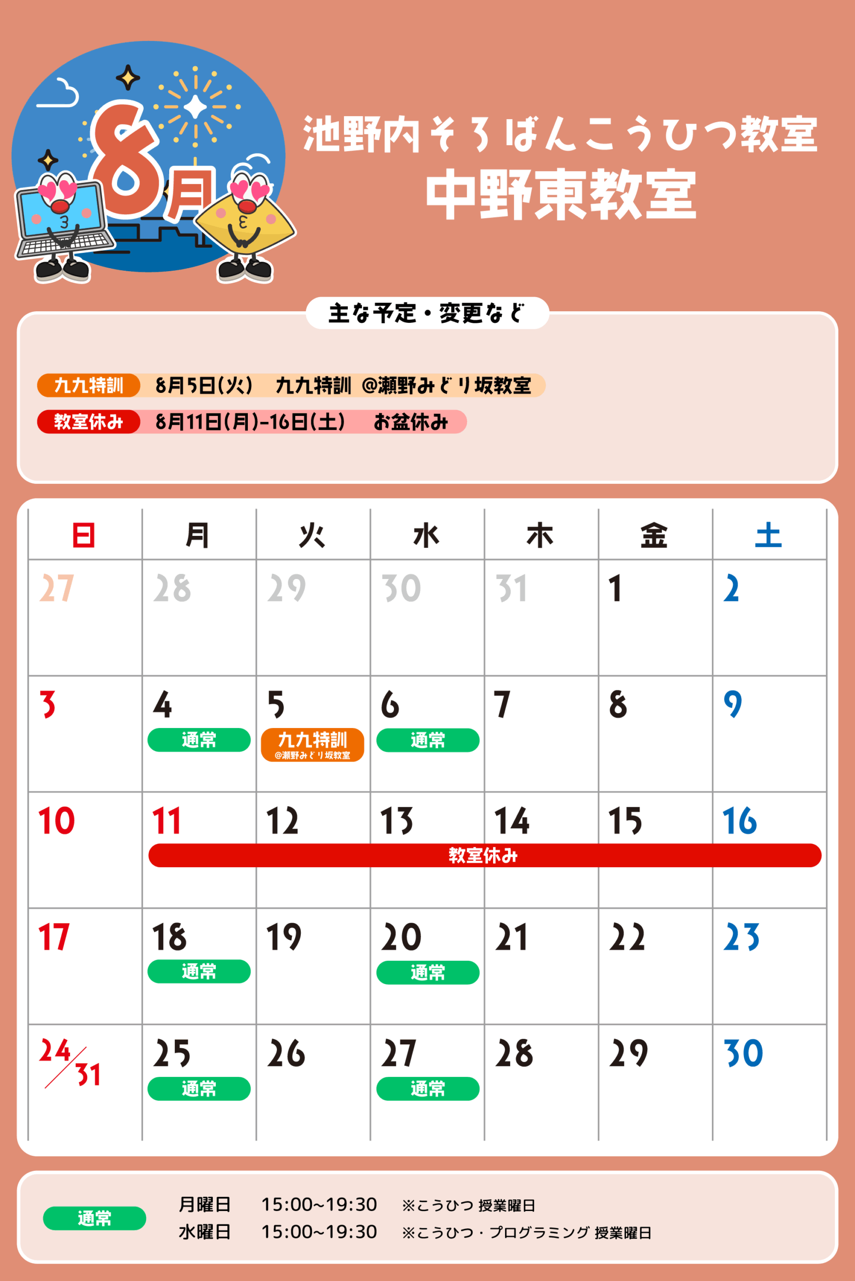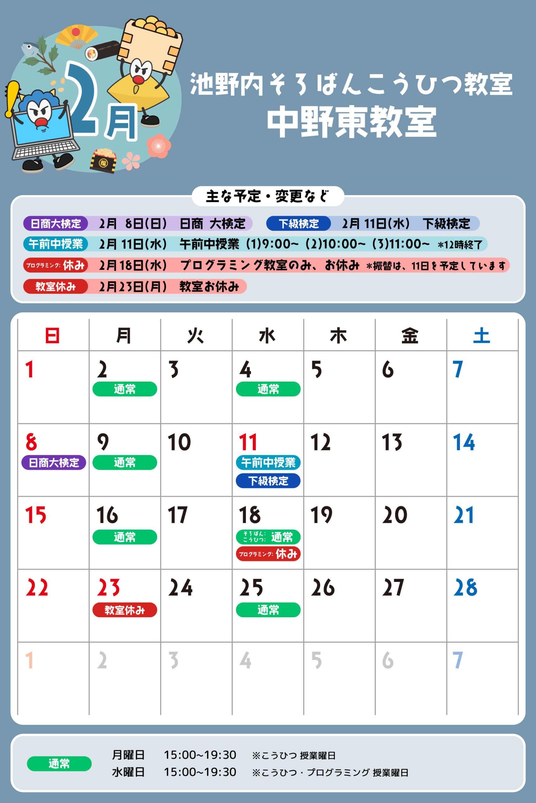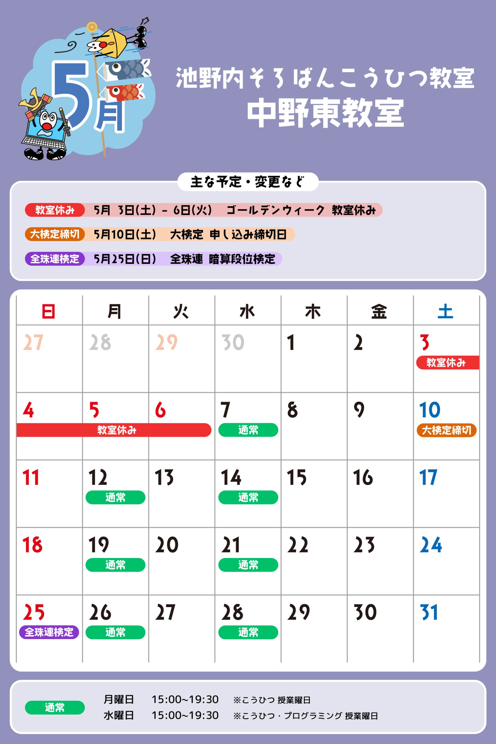 中野東教室 予定表 「通常」の授業曜日・時間 そろばん・暗算 月曜日:15:00〜19:30水曜日:15:00〜19:30 ※最終入室:終了時間の1時間前まで りとるらんど 月曜日:15:00〜19:30水曜日:15:00〜19:30 ※最終入室:終了時間の1時間前まで こうひつ 月曜日:15:00〜19:30 水曜日:15:00〜19:30 ※最終入室:終了時間の30分前まで プログラミング 水曜日:15:00〜19:00 ※最終入室:終了30分前まで ※予定表の「通常」の授業曜日・時間です。 2025